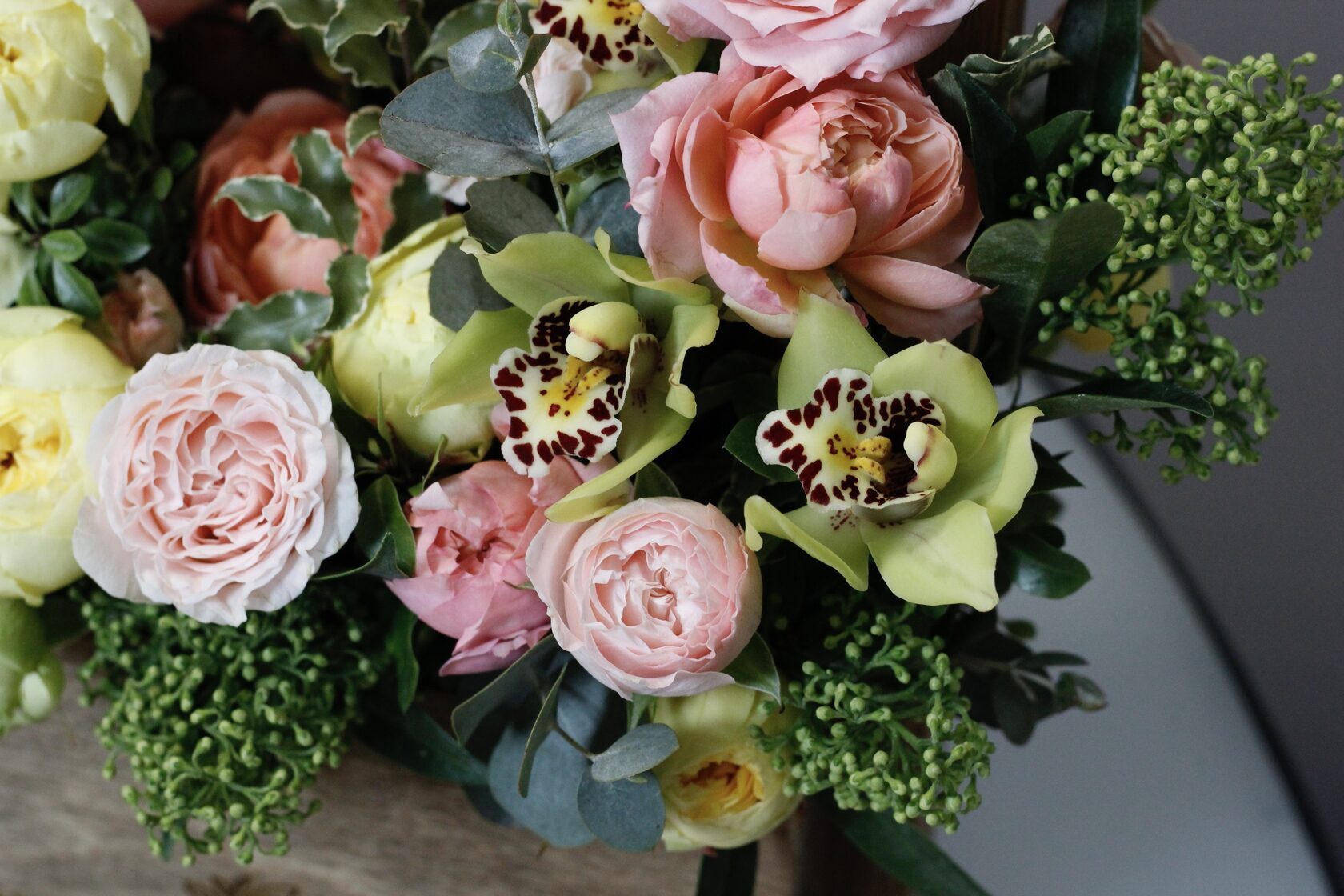 В составе: орхидея, лимонные розочки, пионовидные розы Джульетта, скимия, зелень питоспорума.