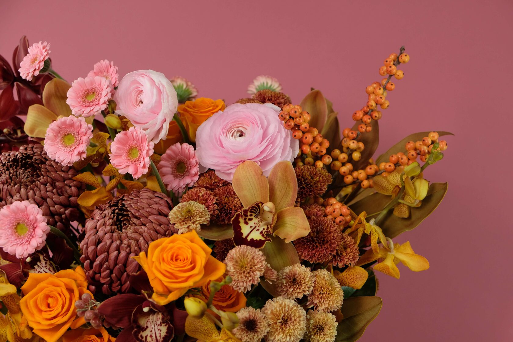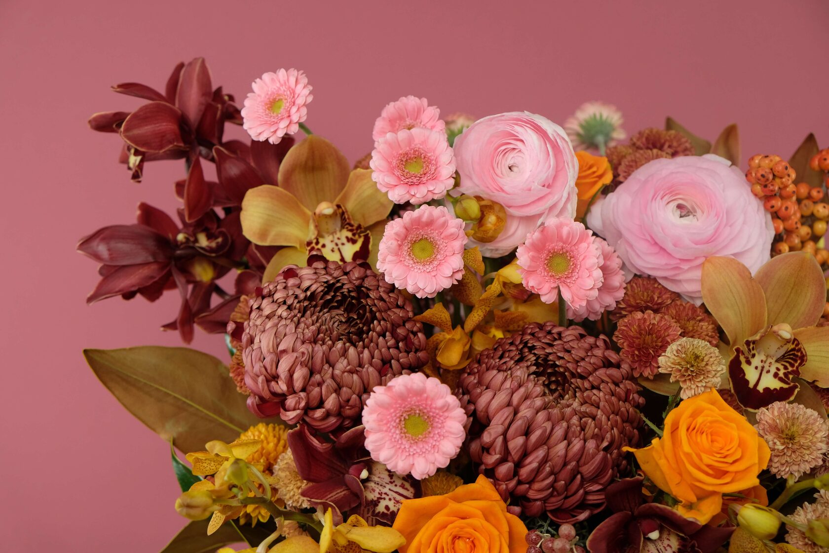 В составе: ранункулюсы, сортовые хризантемы, кустовые сортовые хризантемы нескольких оттенков, розы, орхидеи Цимбидиум, орхидея Ванда, гермини, листья магнолии, ягоды илекса