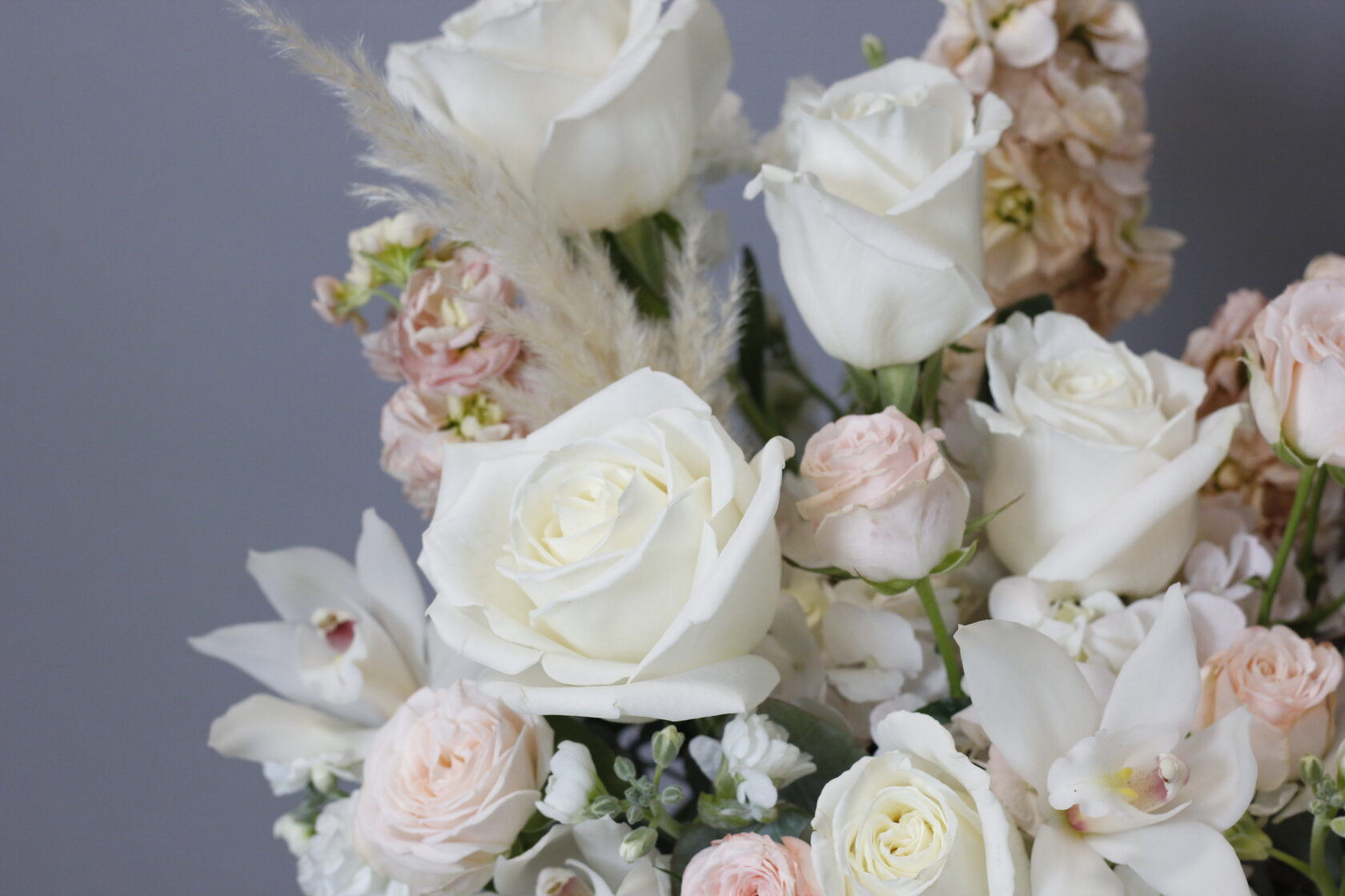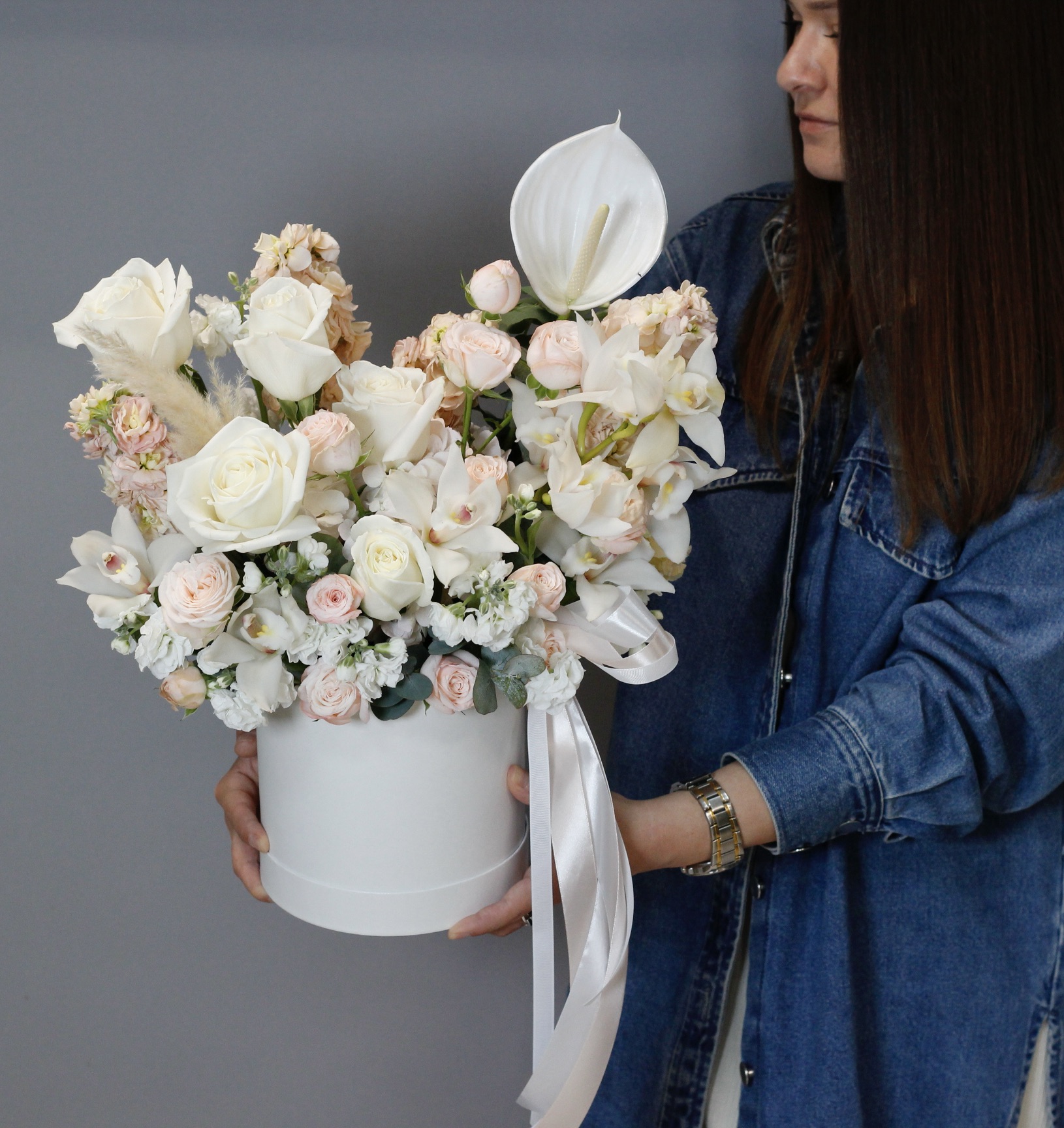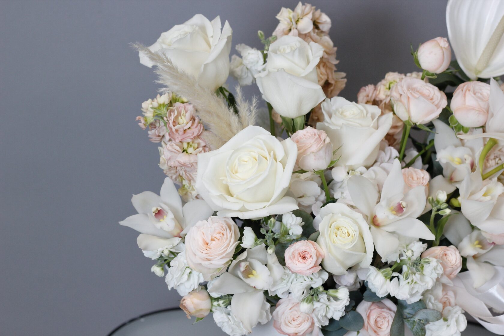 В составе: маттиола, пионовидные розы, орхидеи, гортензия, антуриум, зелень эвкалипта.