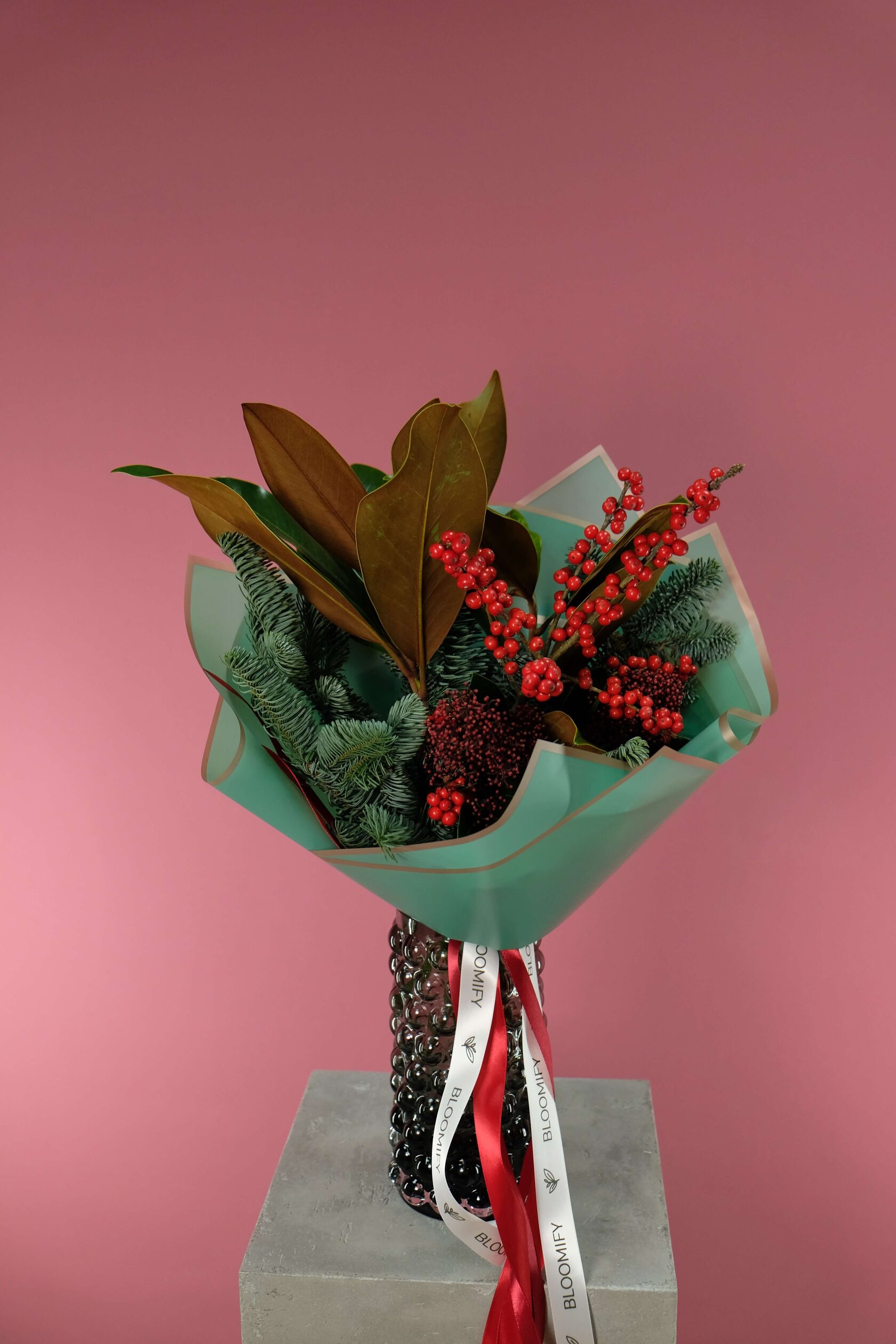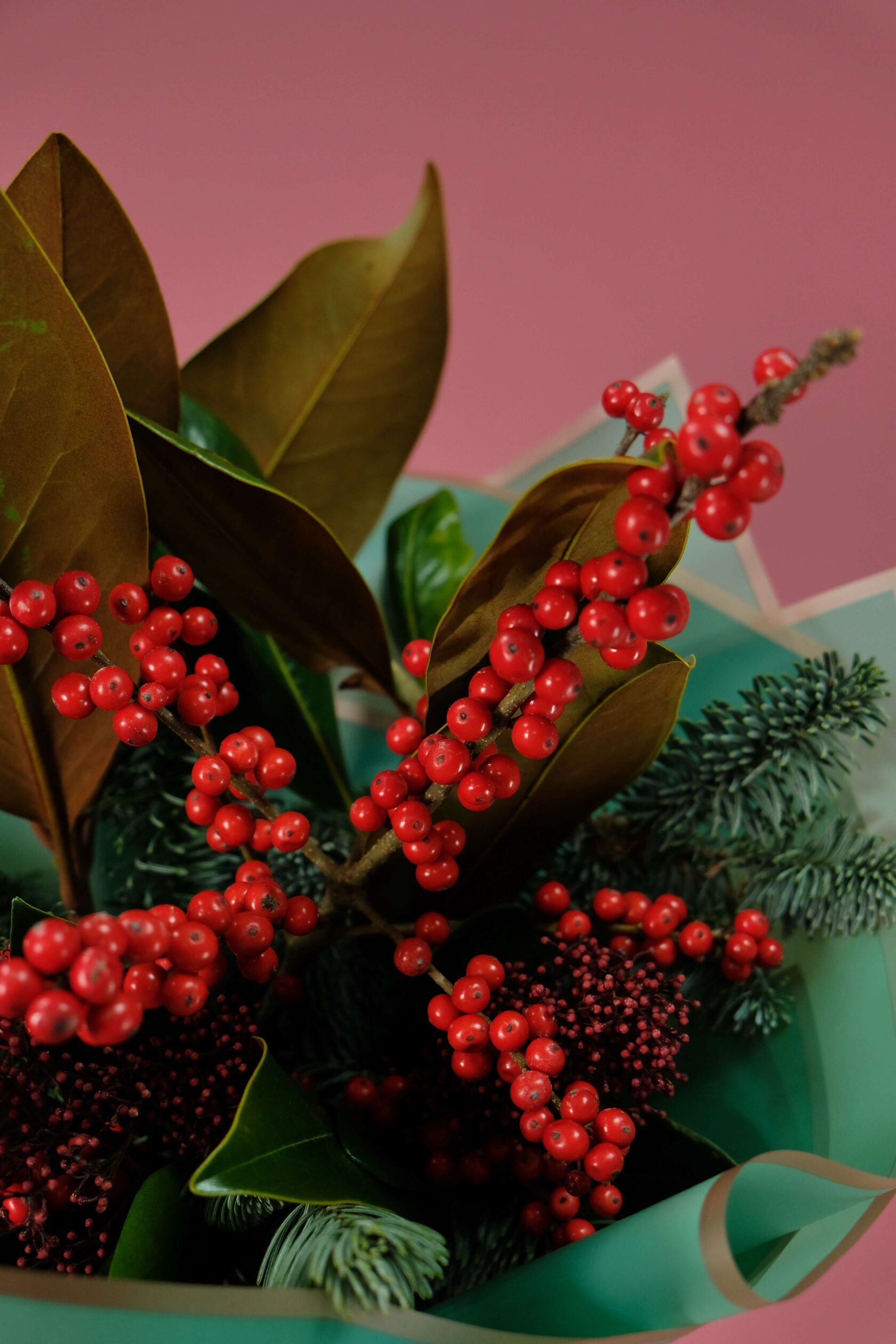 В составе: ягоды илекса, cкимия, веточки магнолии, нобилис (датская ель).