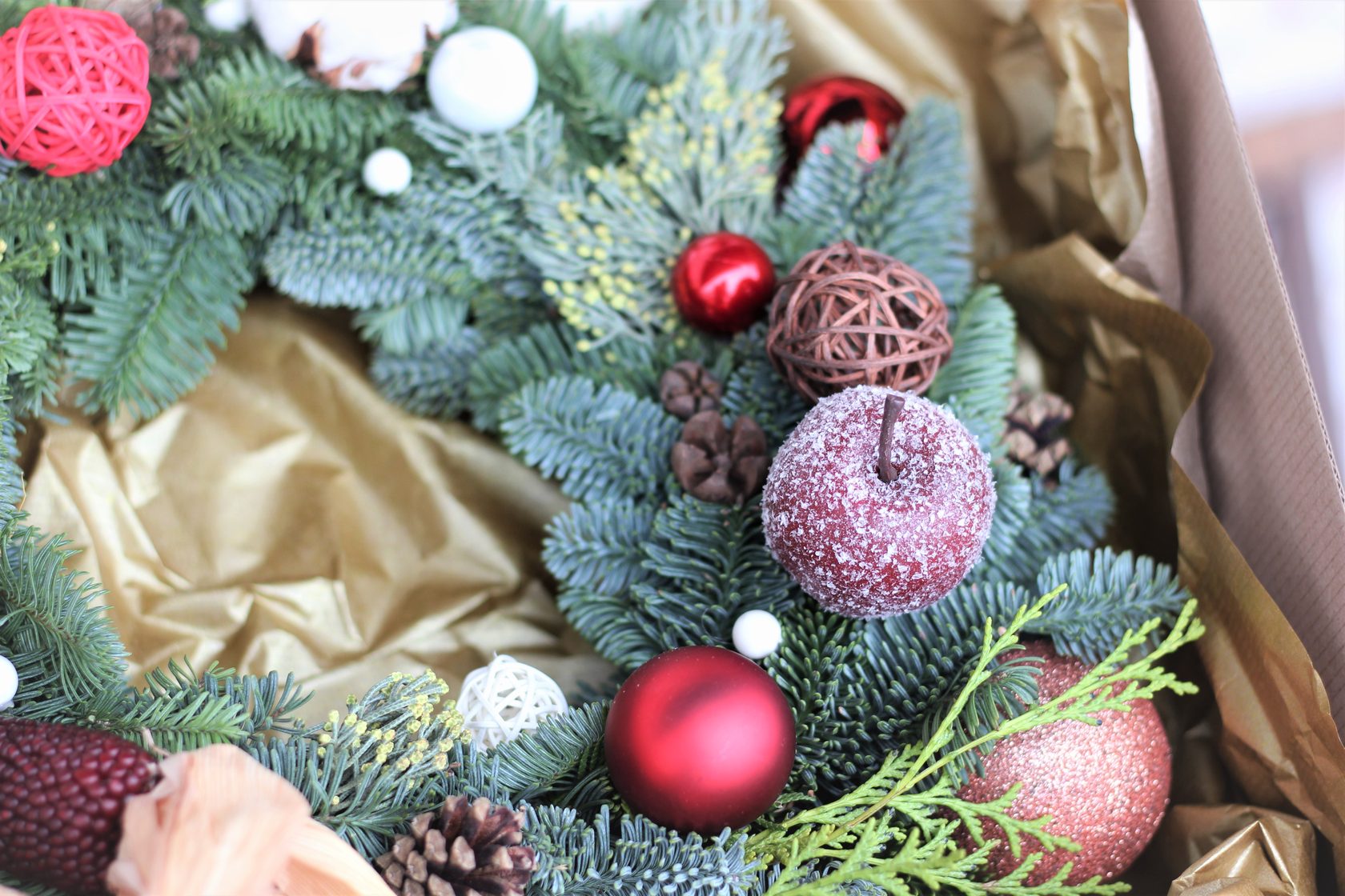 Венок из голубой ели в красно-белой гамме