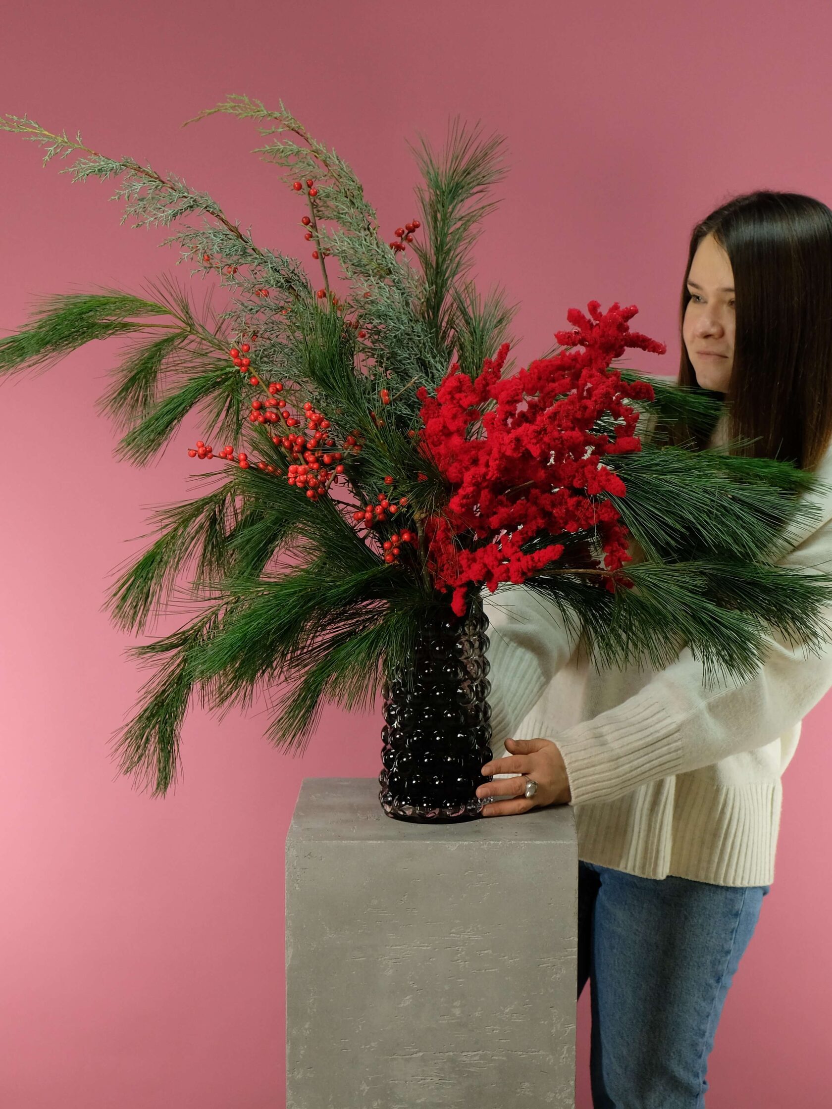 Интерьерный букет из хвои нескольких сортов, веток илекса и декоративного аспарагуса.