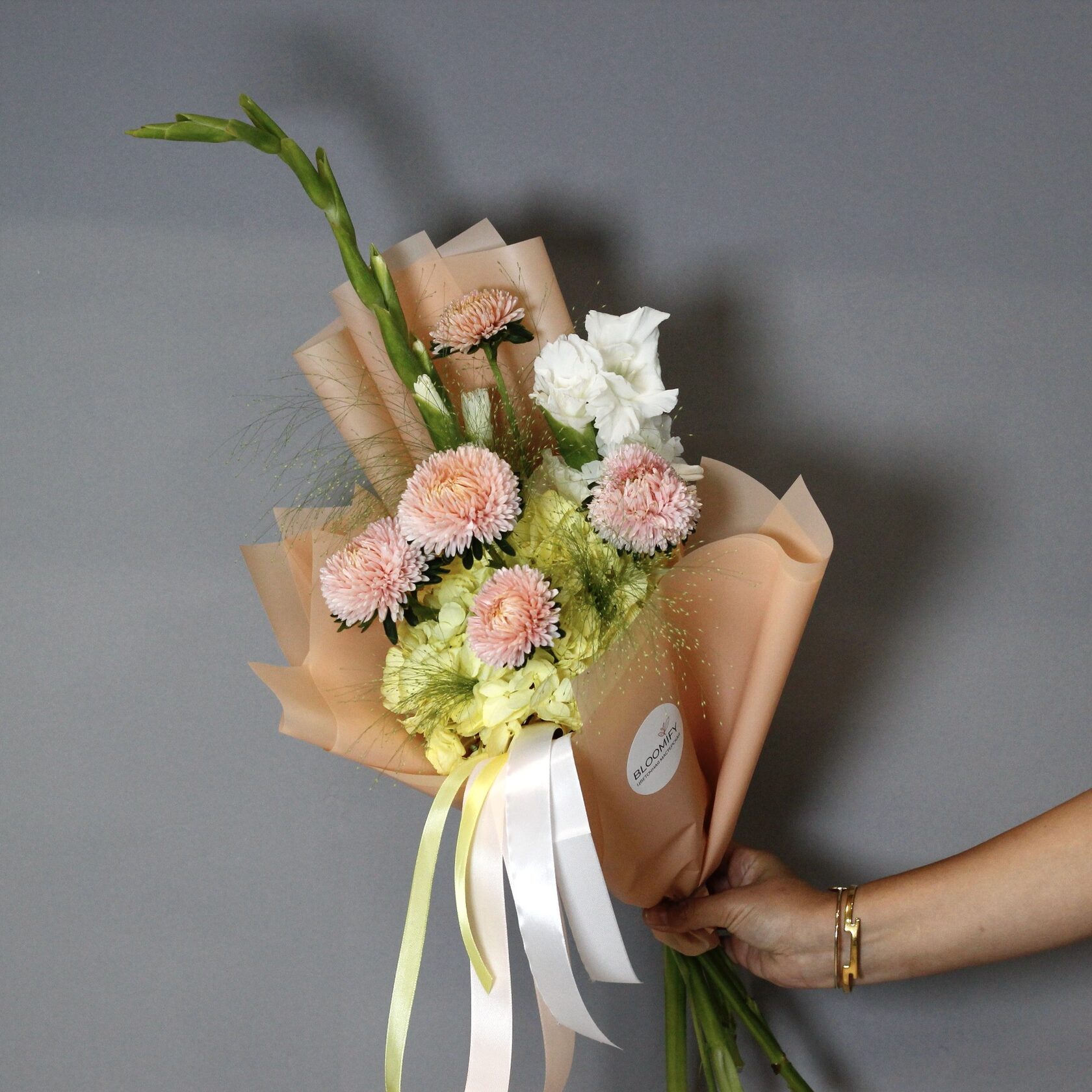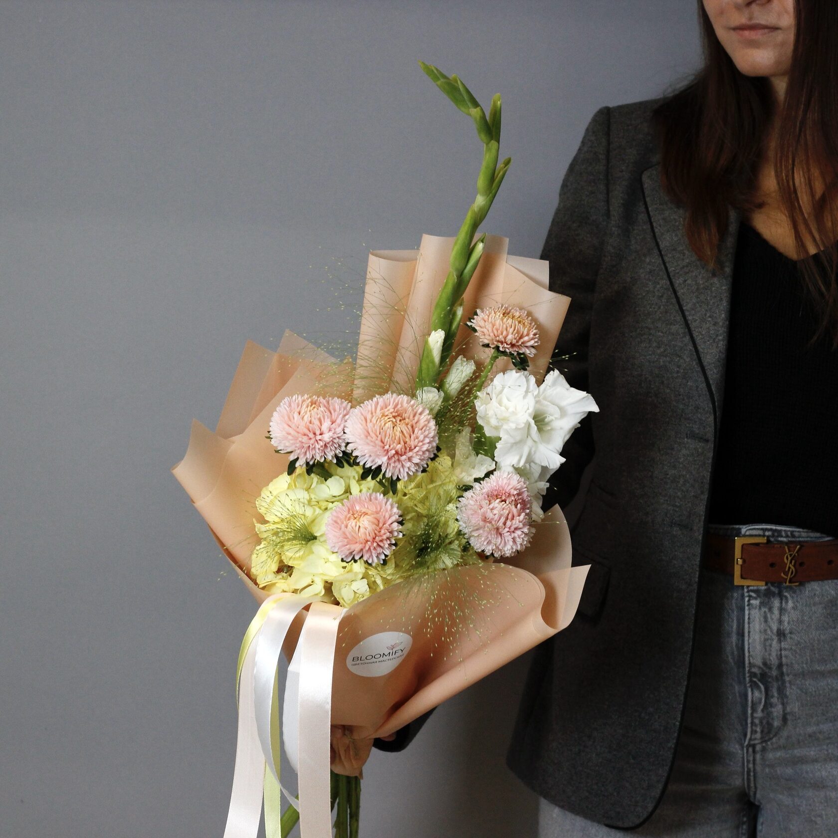 Компактный и легкий букет с неотъемлемыми цветами Дня Знаний - гладиолусами в нежной универсальной гамме.