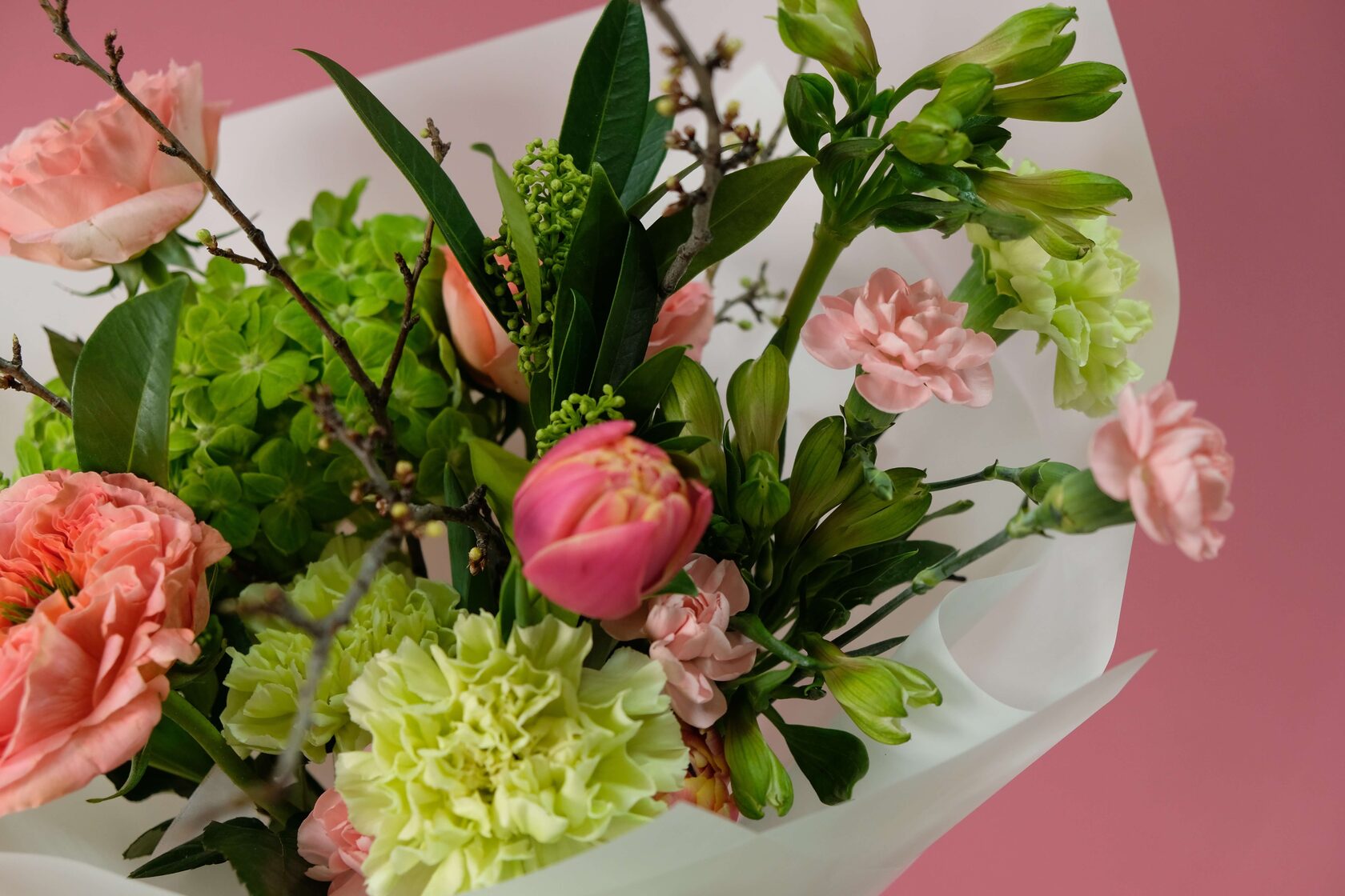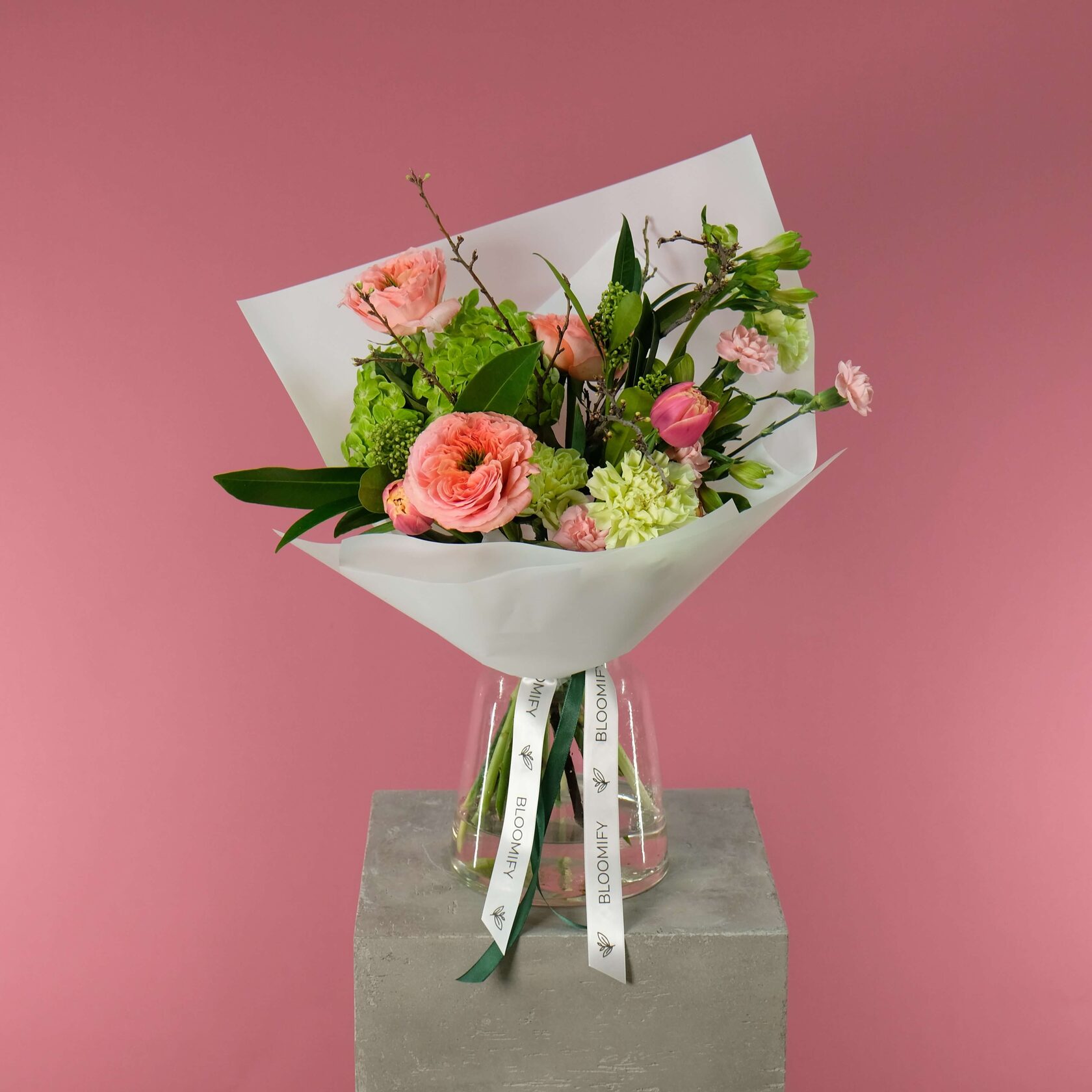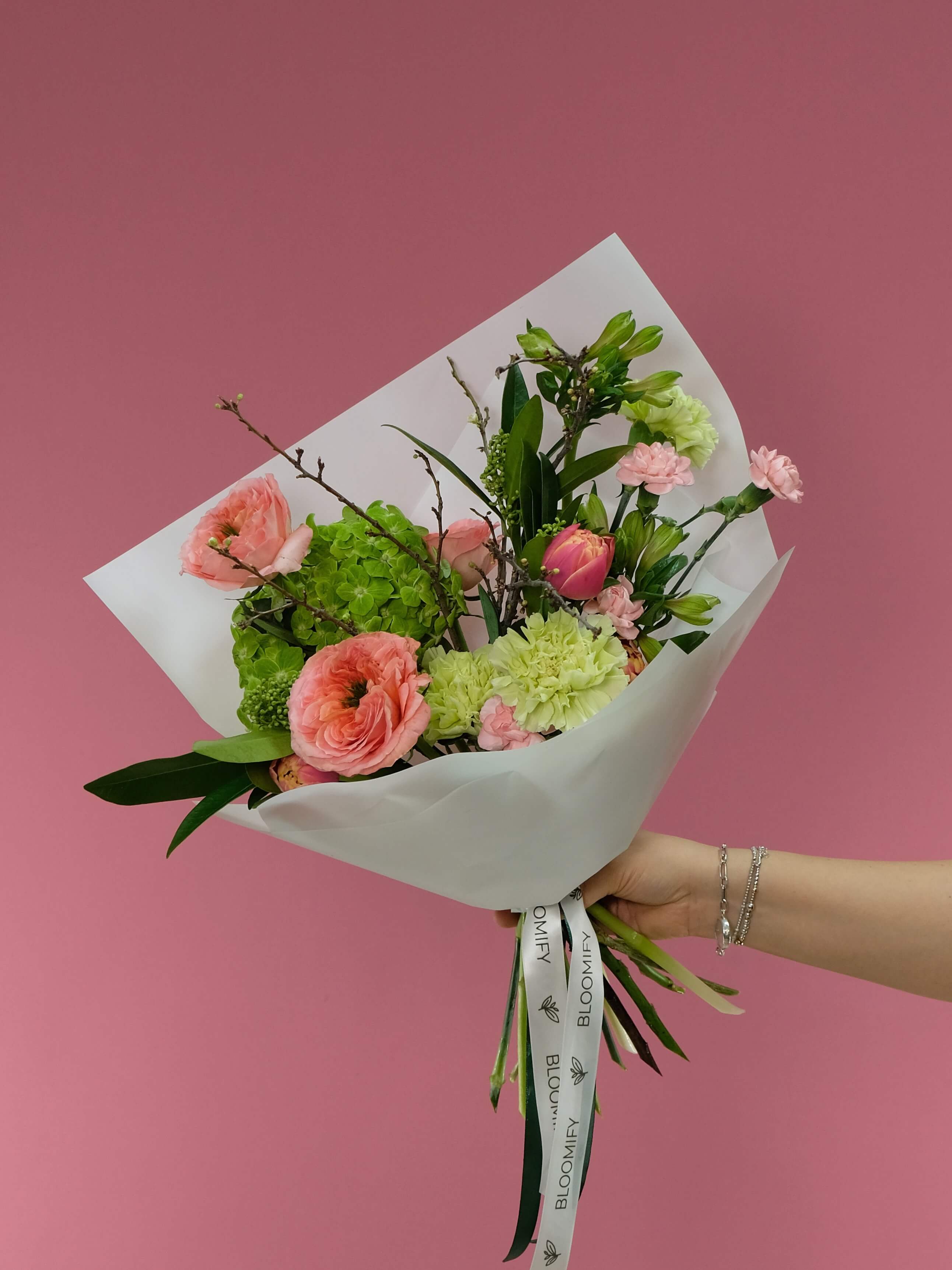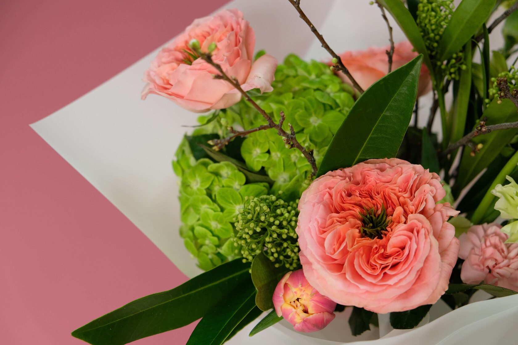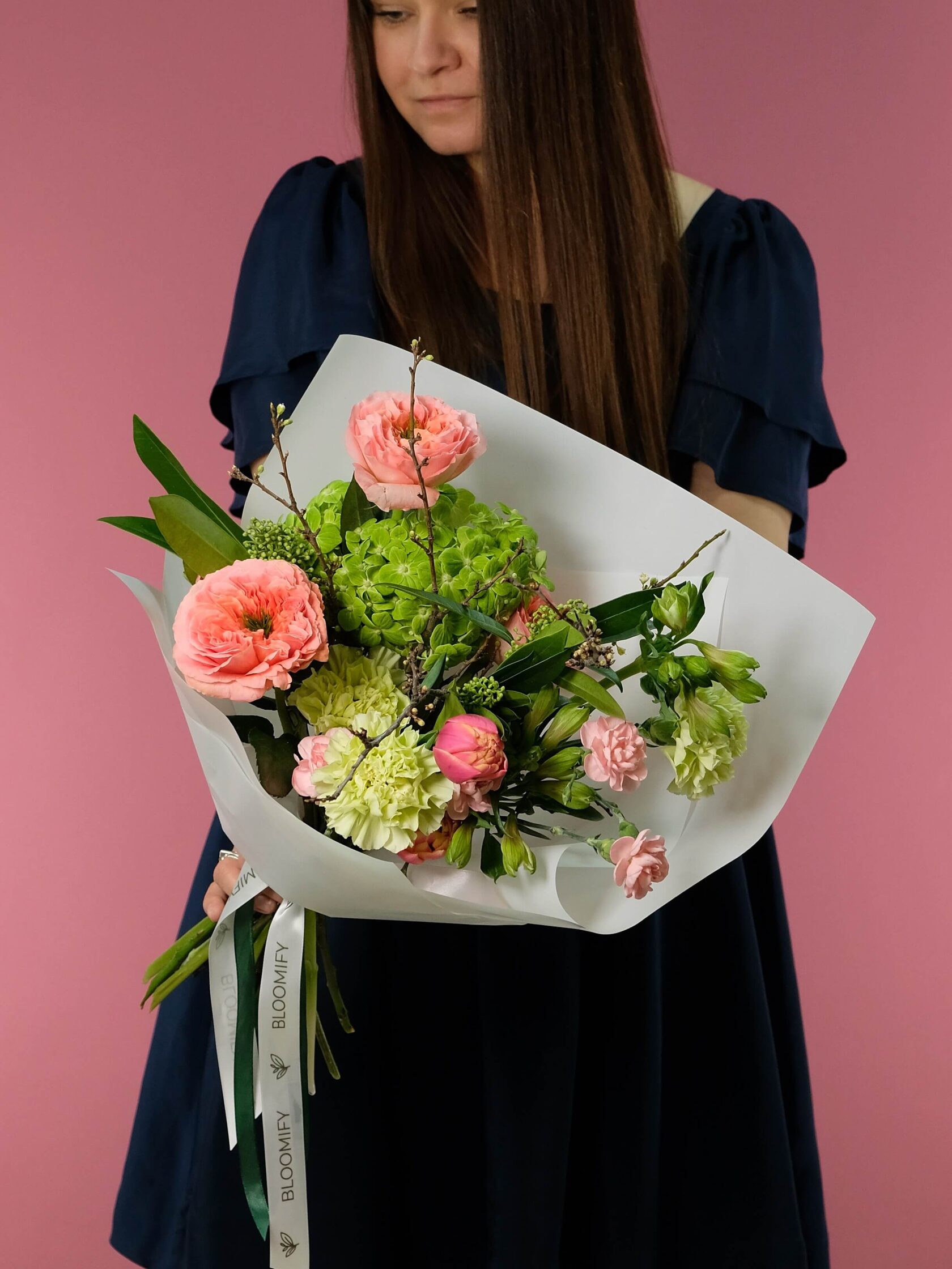 В составе: пионовидные розы, гортензия, диантусы, скимия, пионовидные тюльпаны, альстромерия, ветки