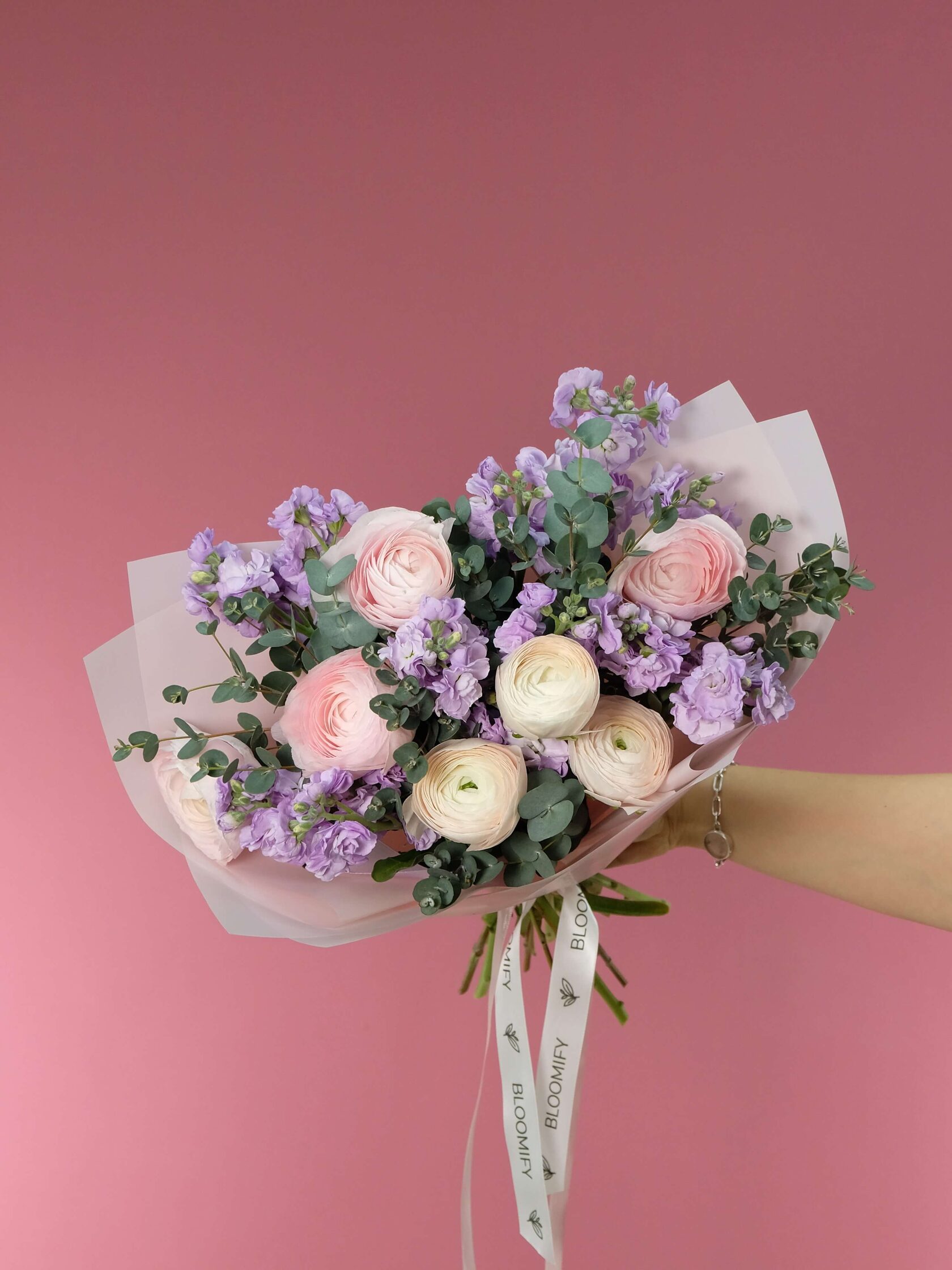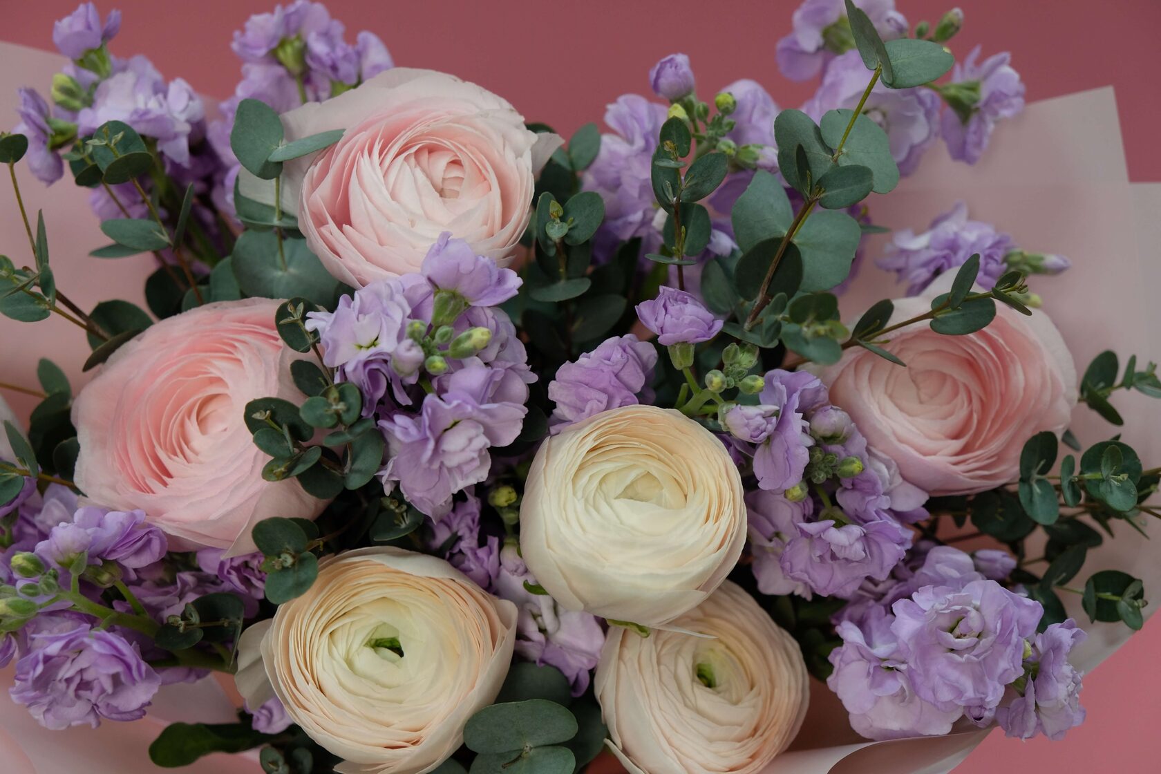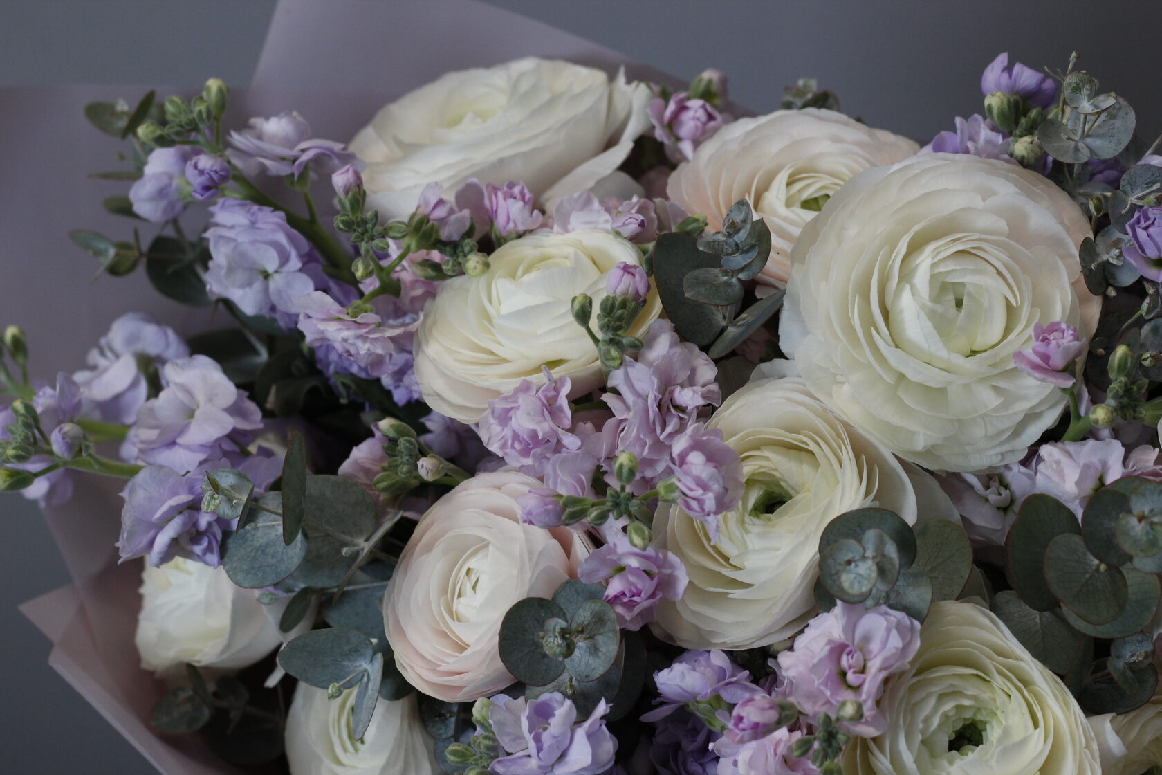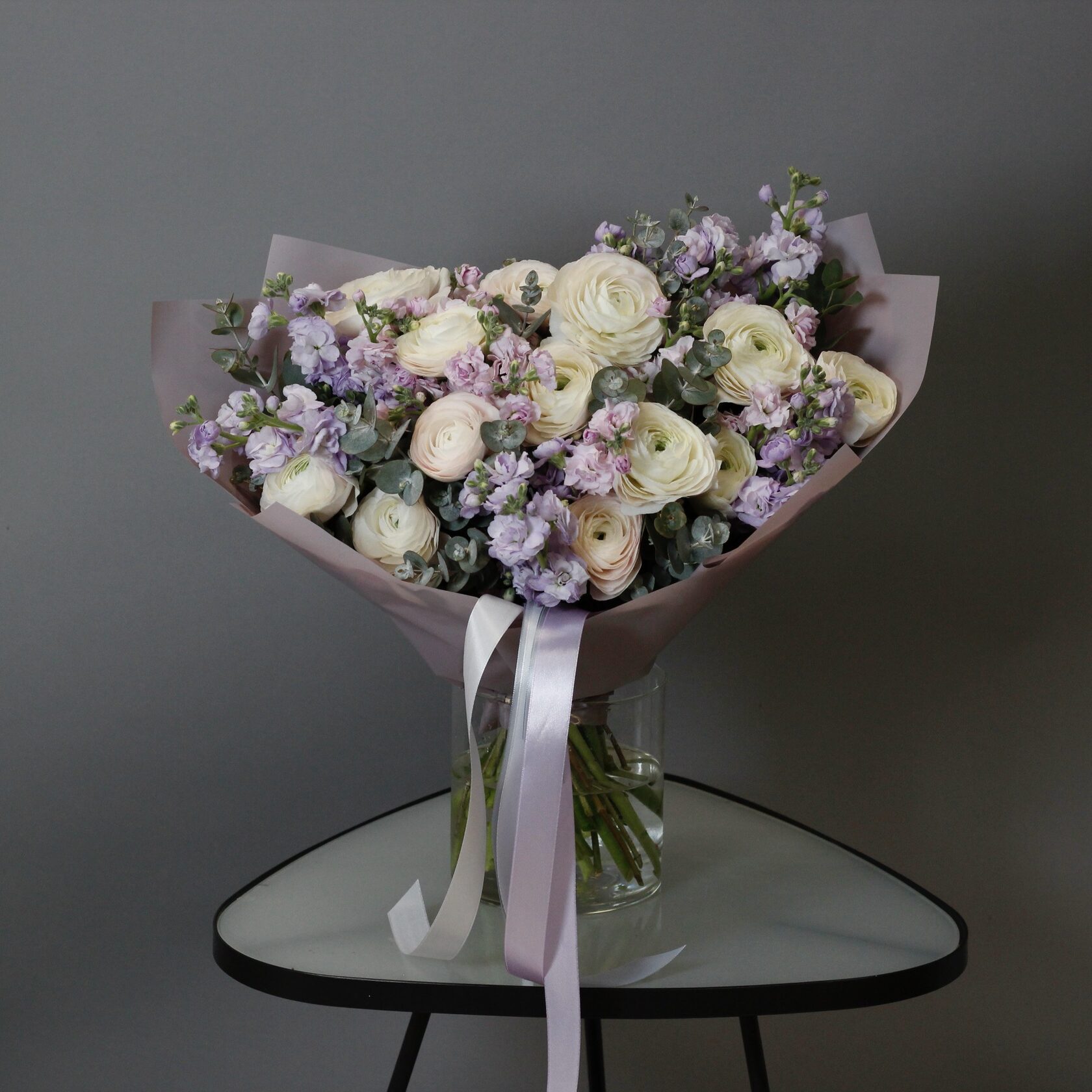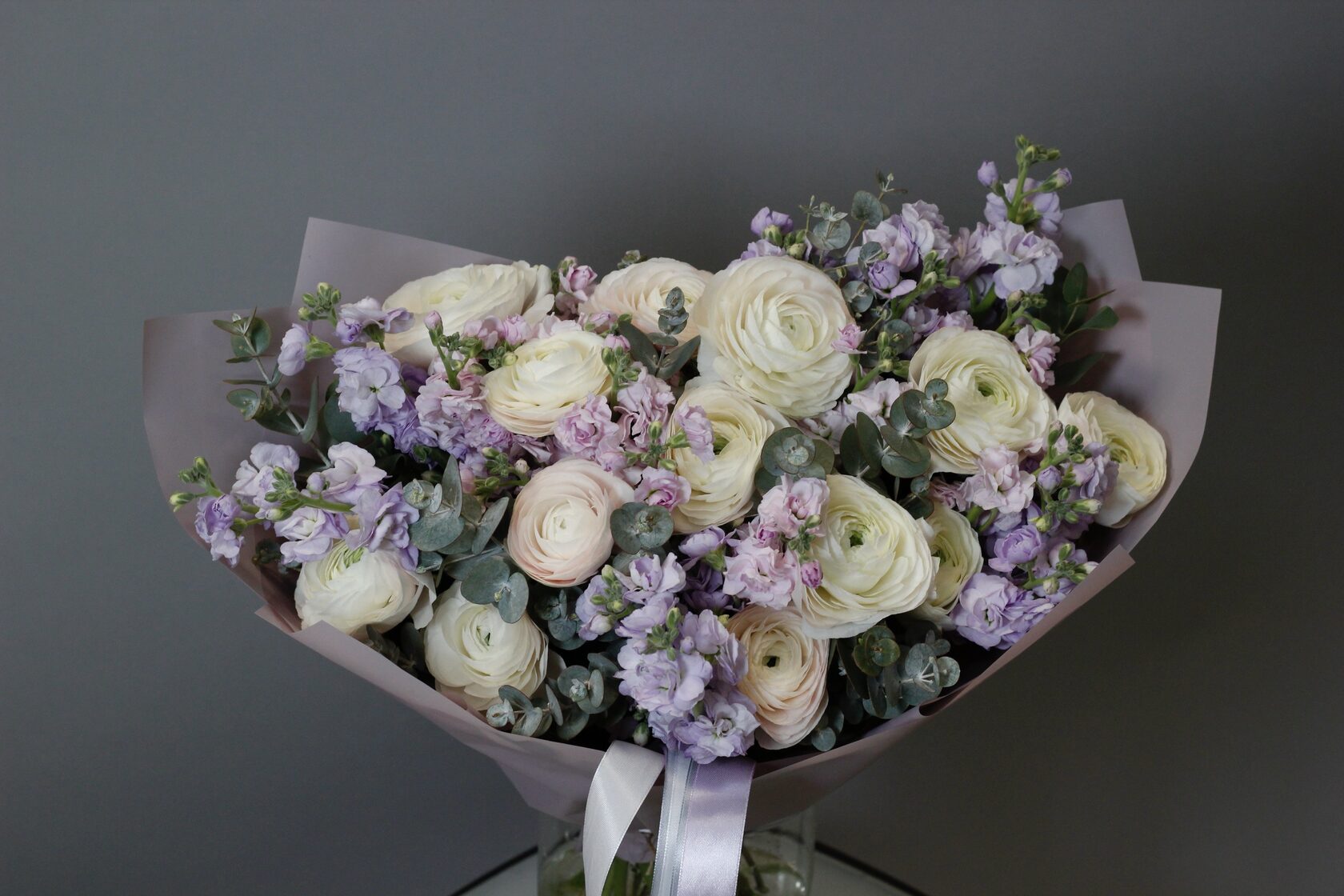 Комбо из невероятных всеми обожаемых ранункулюсов и ароматной маттиолы.