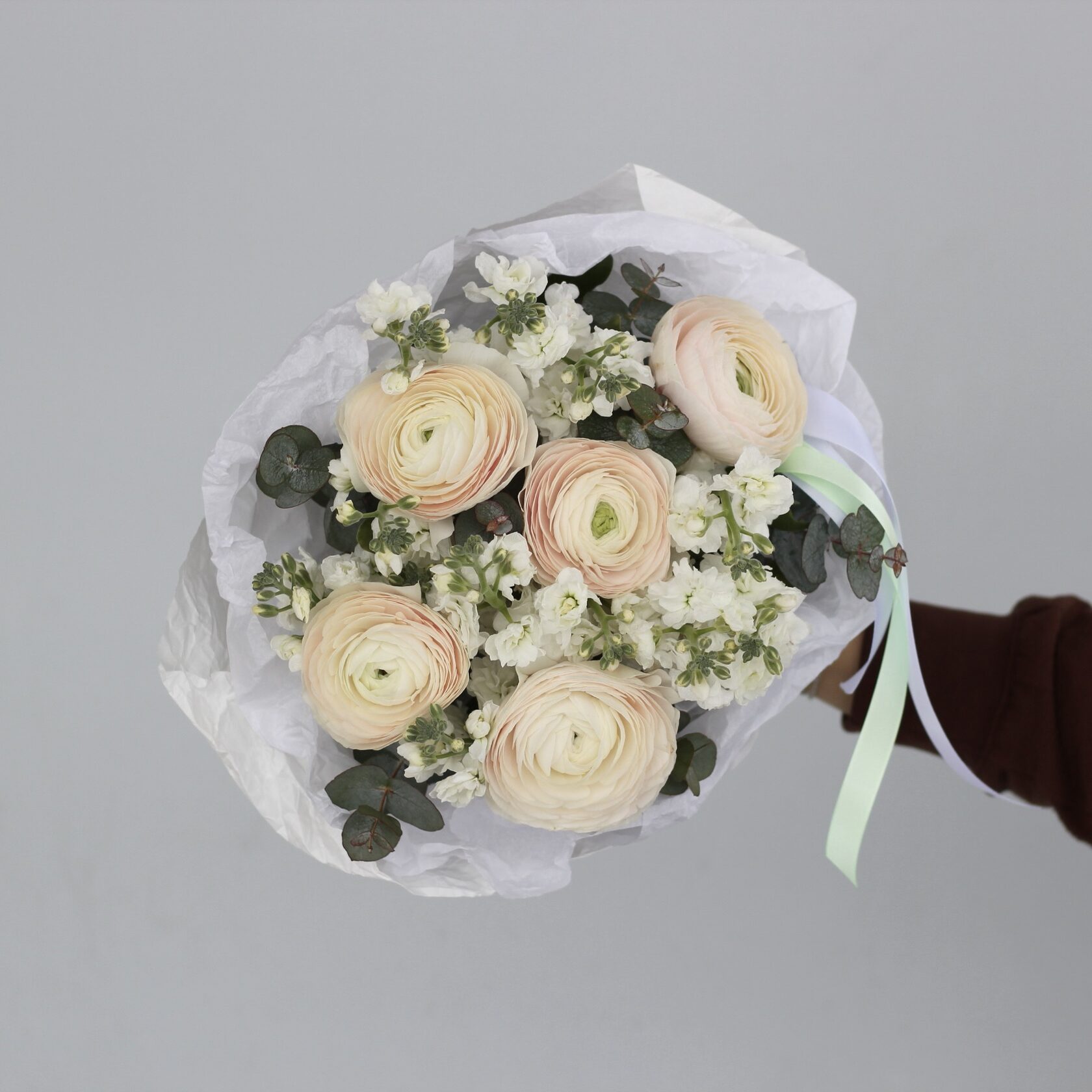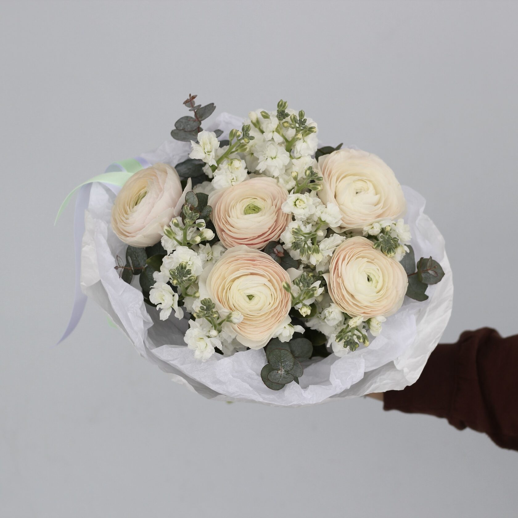 Комбо из невероятных всеми обожаемых ранункулюсов и ароматной маттиолы.