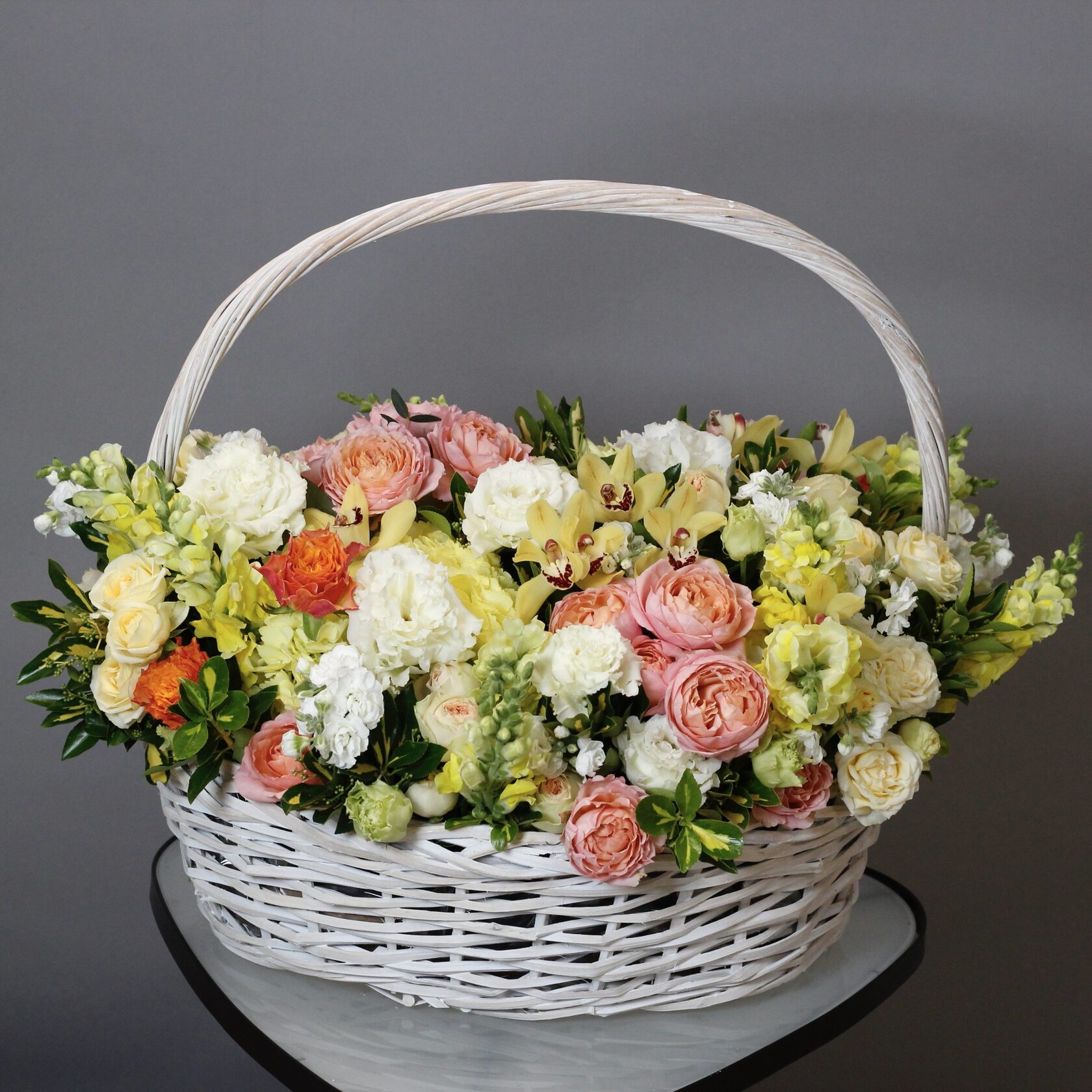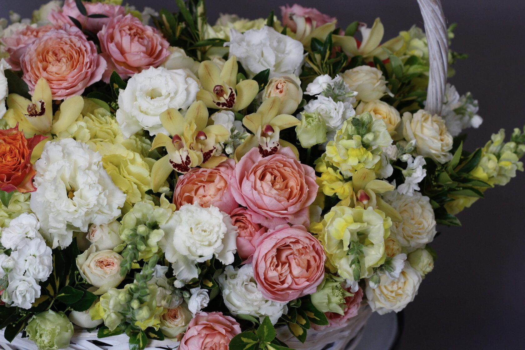 В составе: орхидеи нескольких сортов, тюльпаны, кустовые пионовидные розы Джульетта, Павлова, эустома, ранункулюсы, веточки скимии, шамелациум