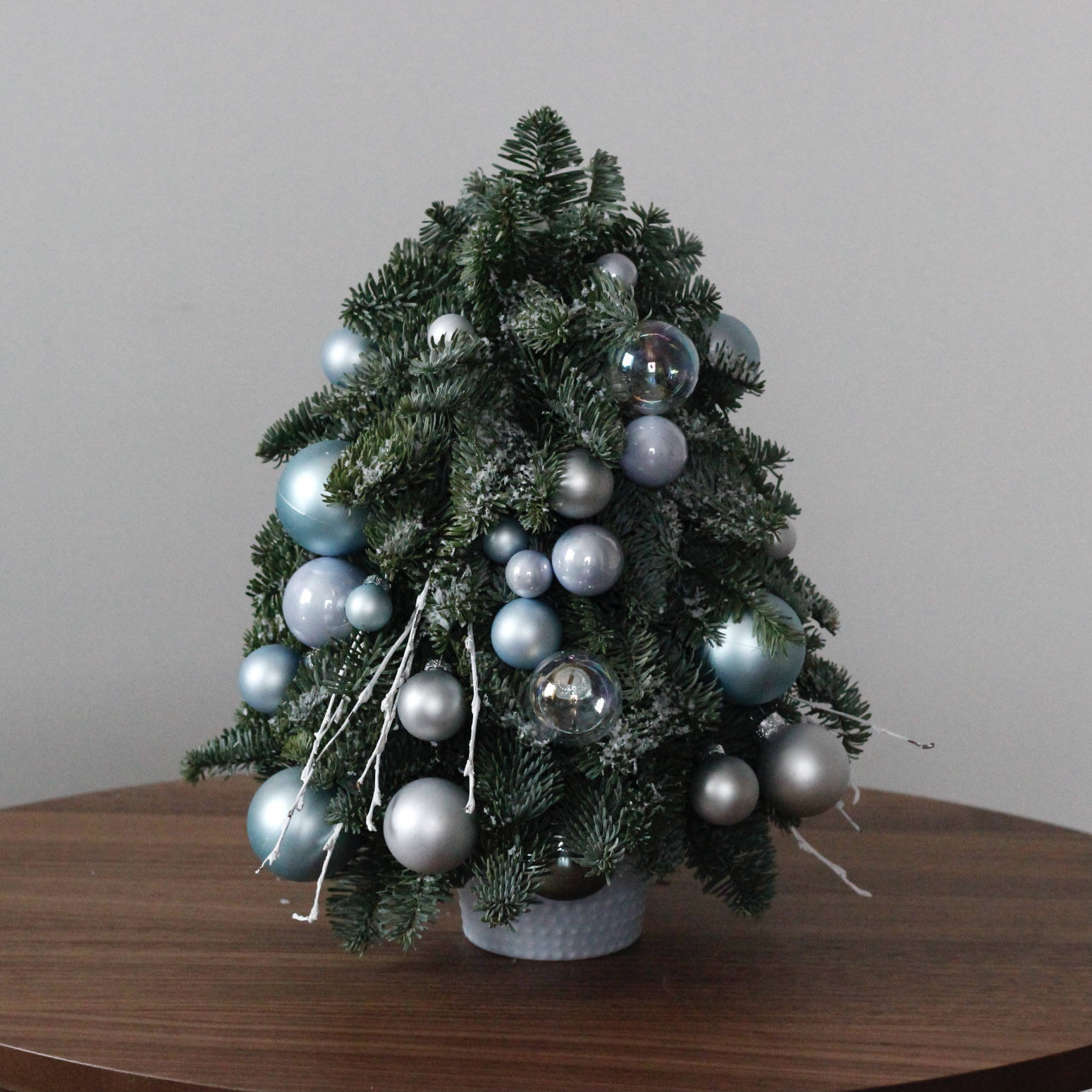 Авторская елочка ручной работы из живой датской голубой ели в монохромной бело-голубой гамме.