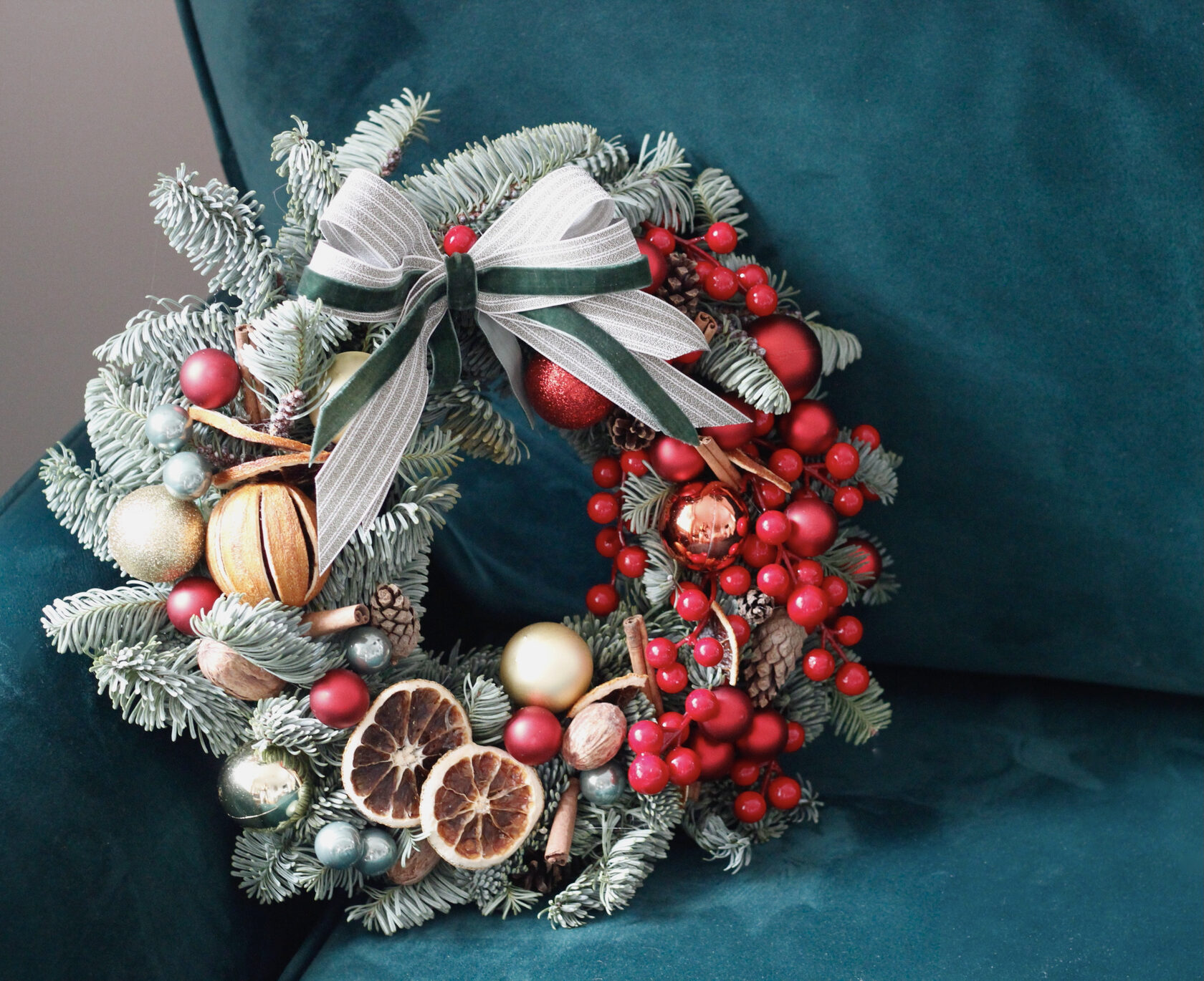 Рождественский венок из живой голубой датской ели в классической рождественской гамме с декором из стеклянных шаров, сухоцветов, ягодных веточек и апельсинов.