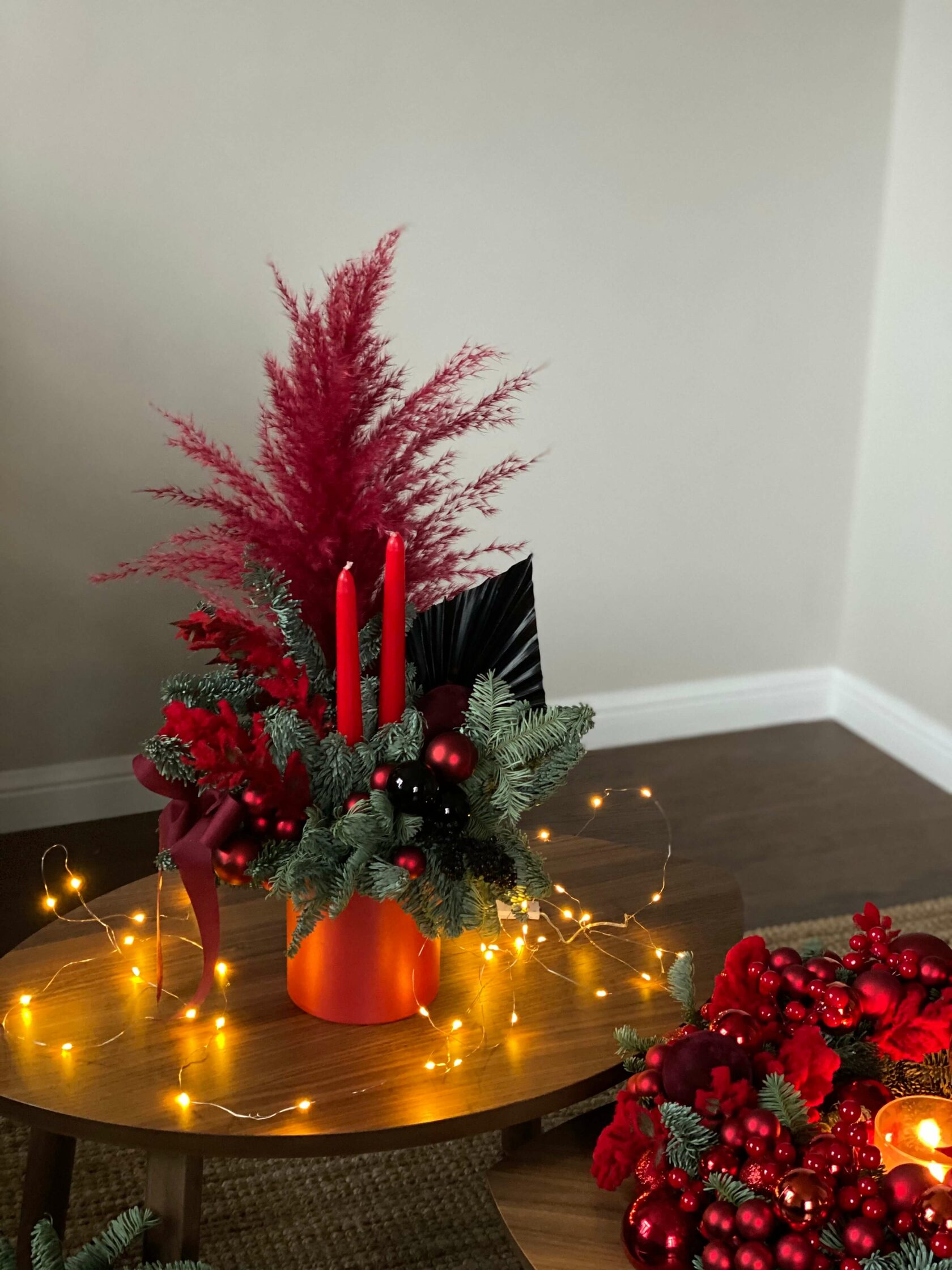 Декорирована стеклянными шарами и сухоцветами.
