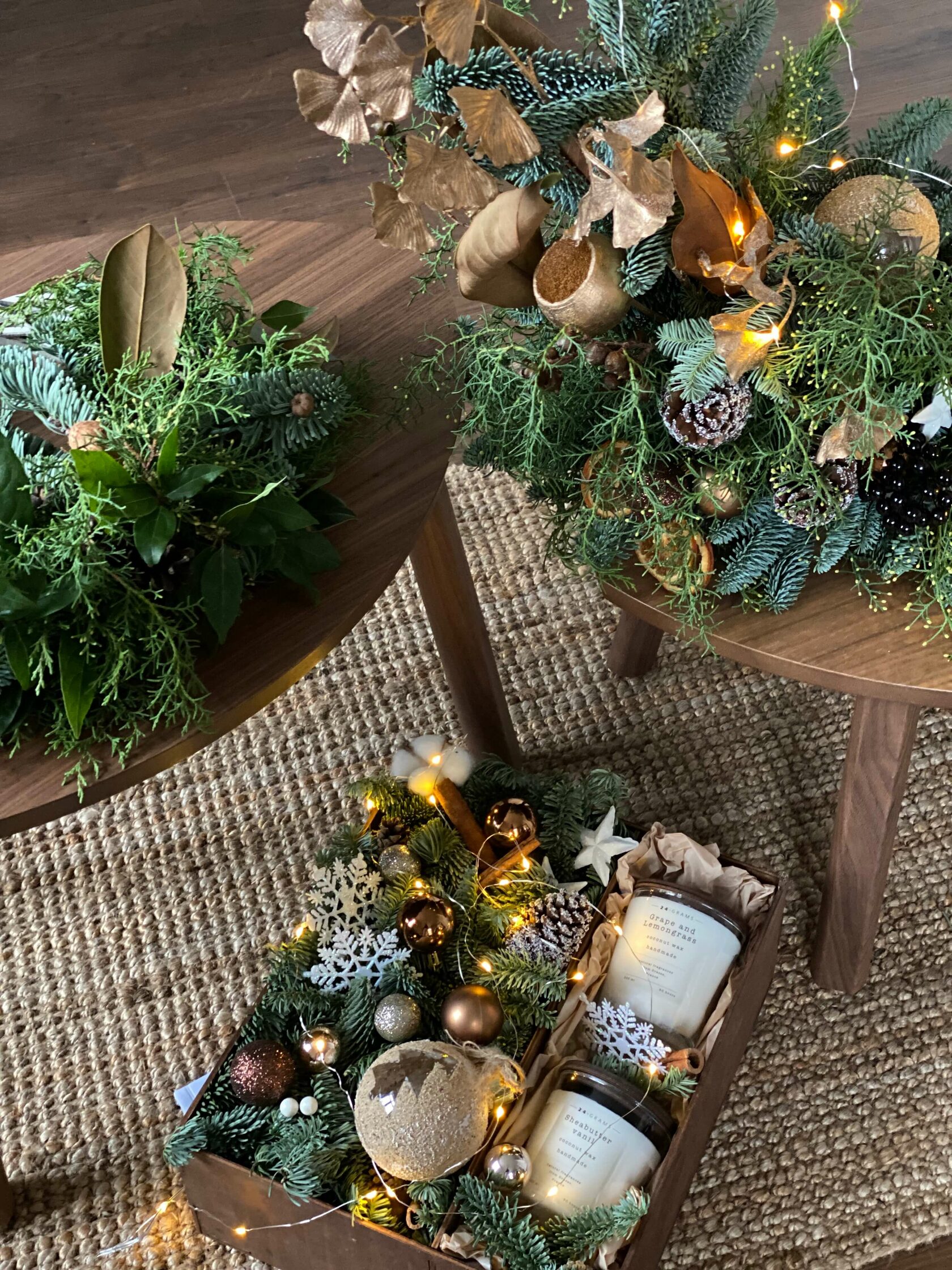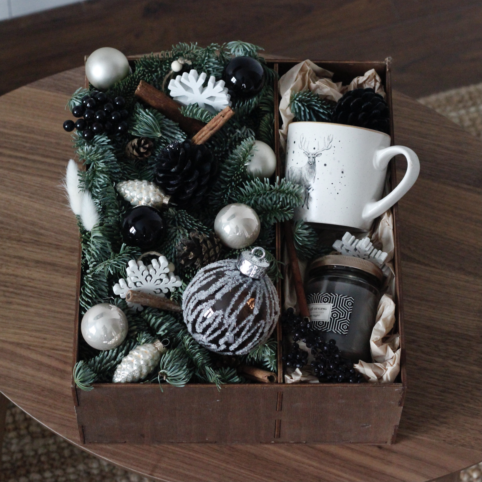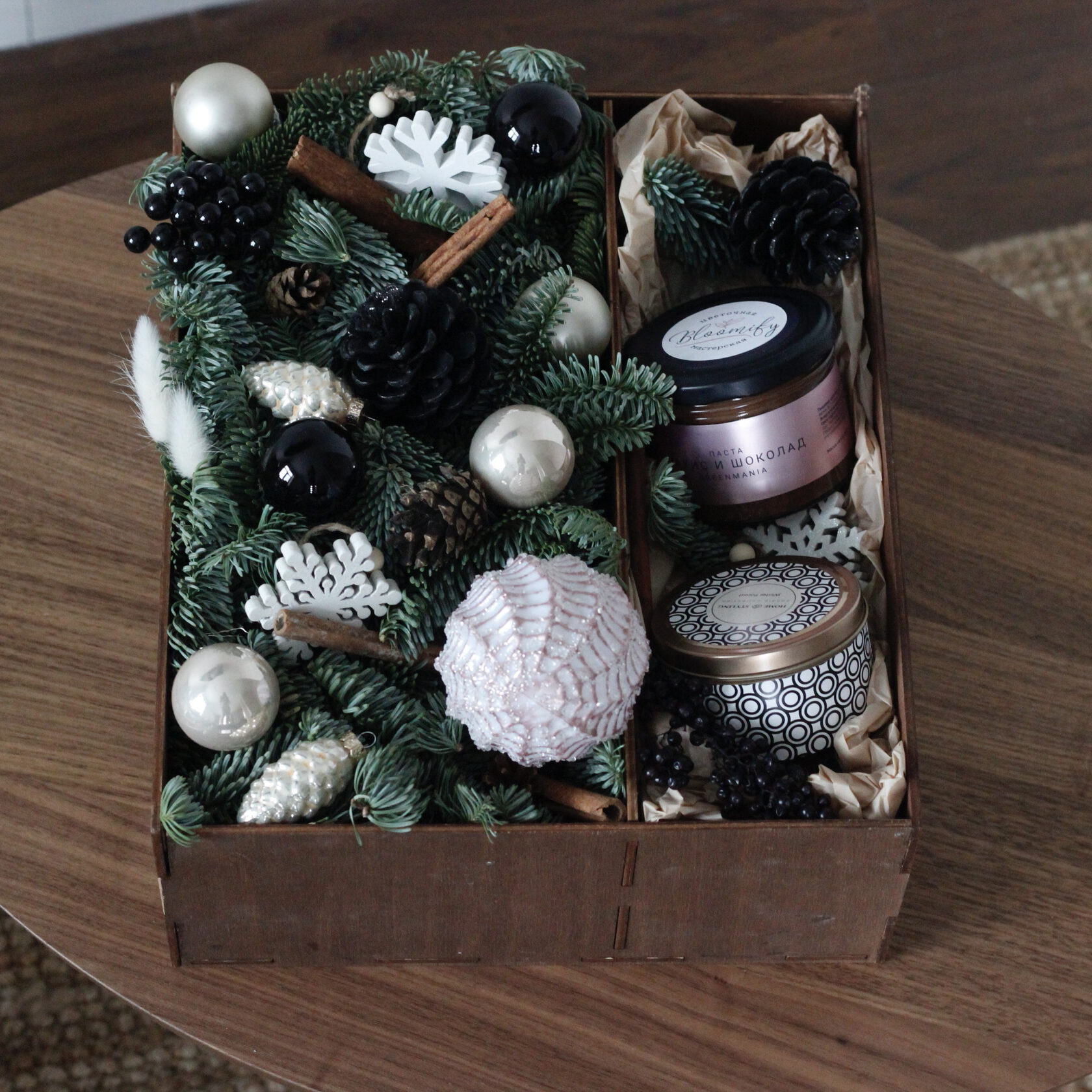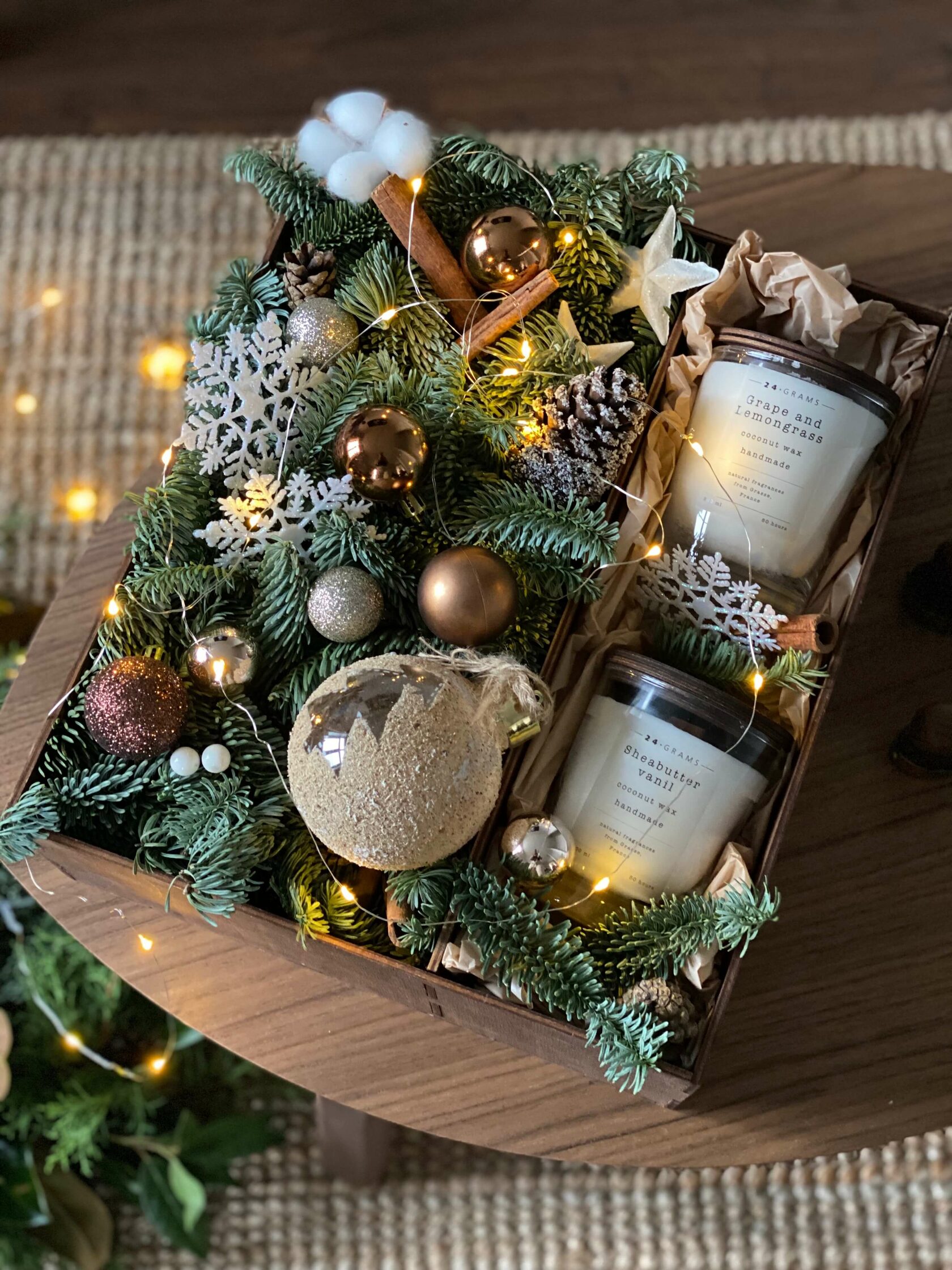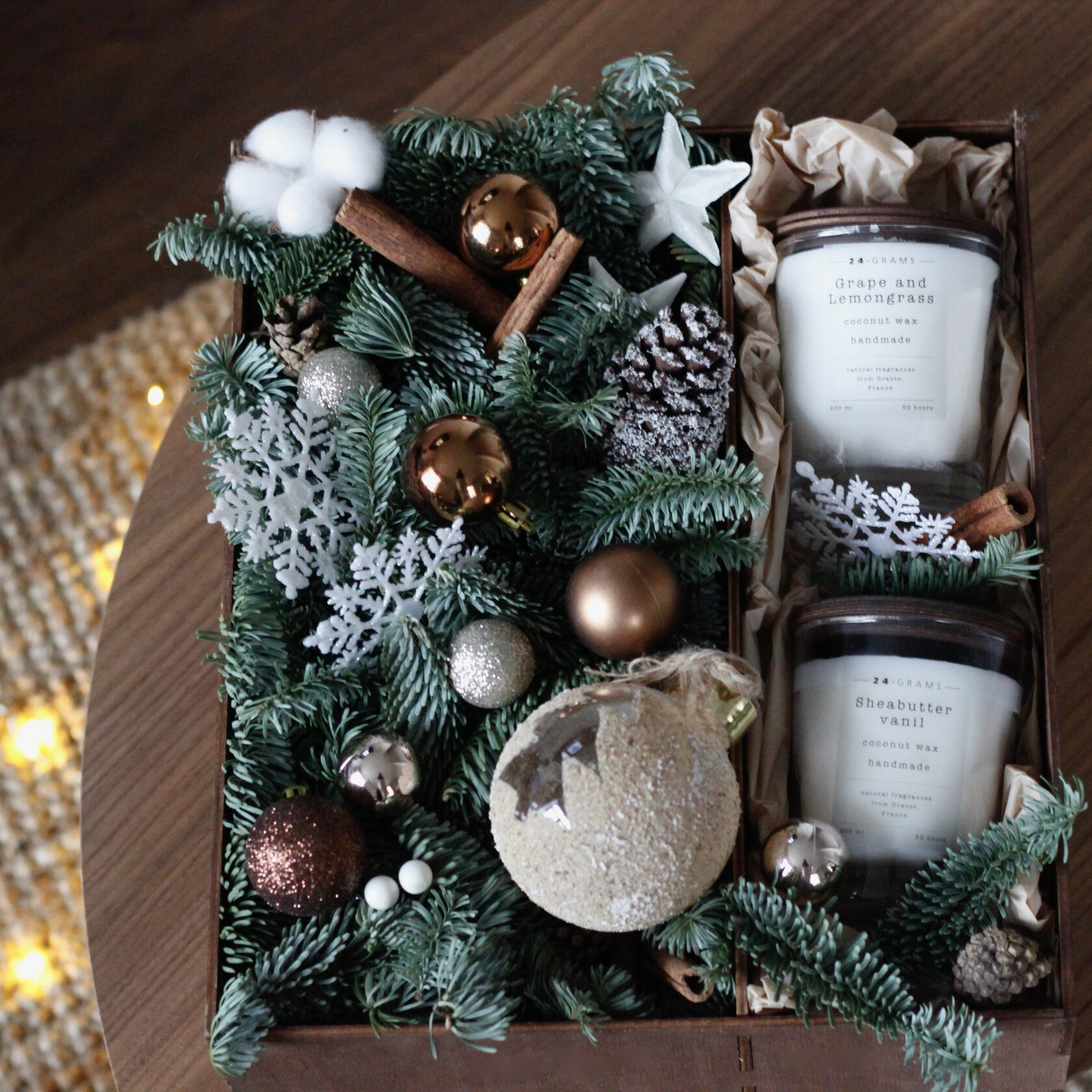 Стильная деревянная коробочка с зимней композицией из живой голландской ели, игрушек и декоративных элементов. Коробочка дополнена ароматическими свечами из растительного воска с деревянным фитилем, потрескивающим при горении.