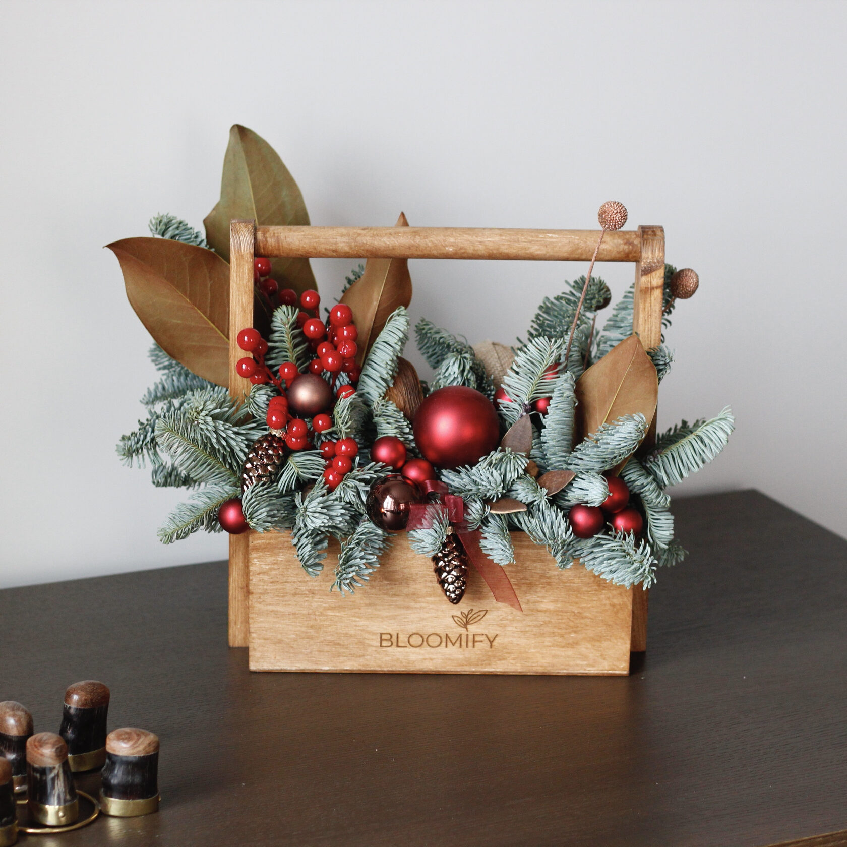 Авторская новогодняя композиция из живой голубой датской ели в деревянном кашпо. Декорирована стеклянными игрушками, сухоцветами и веточками магнолии. Композиция сохранит презентабельный вид в течение всех новогодних праздников.