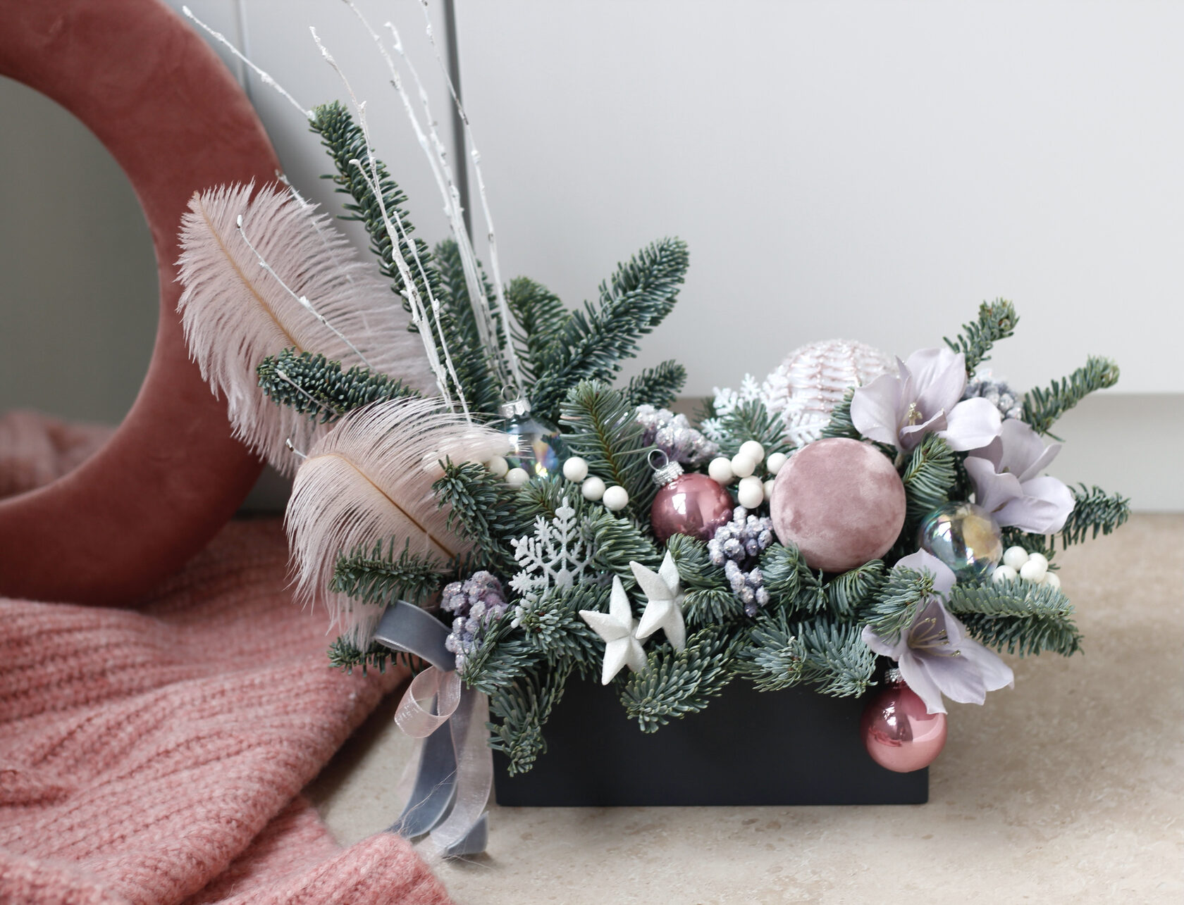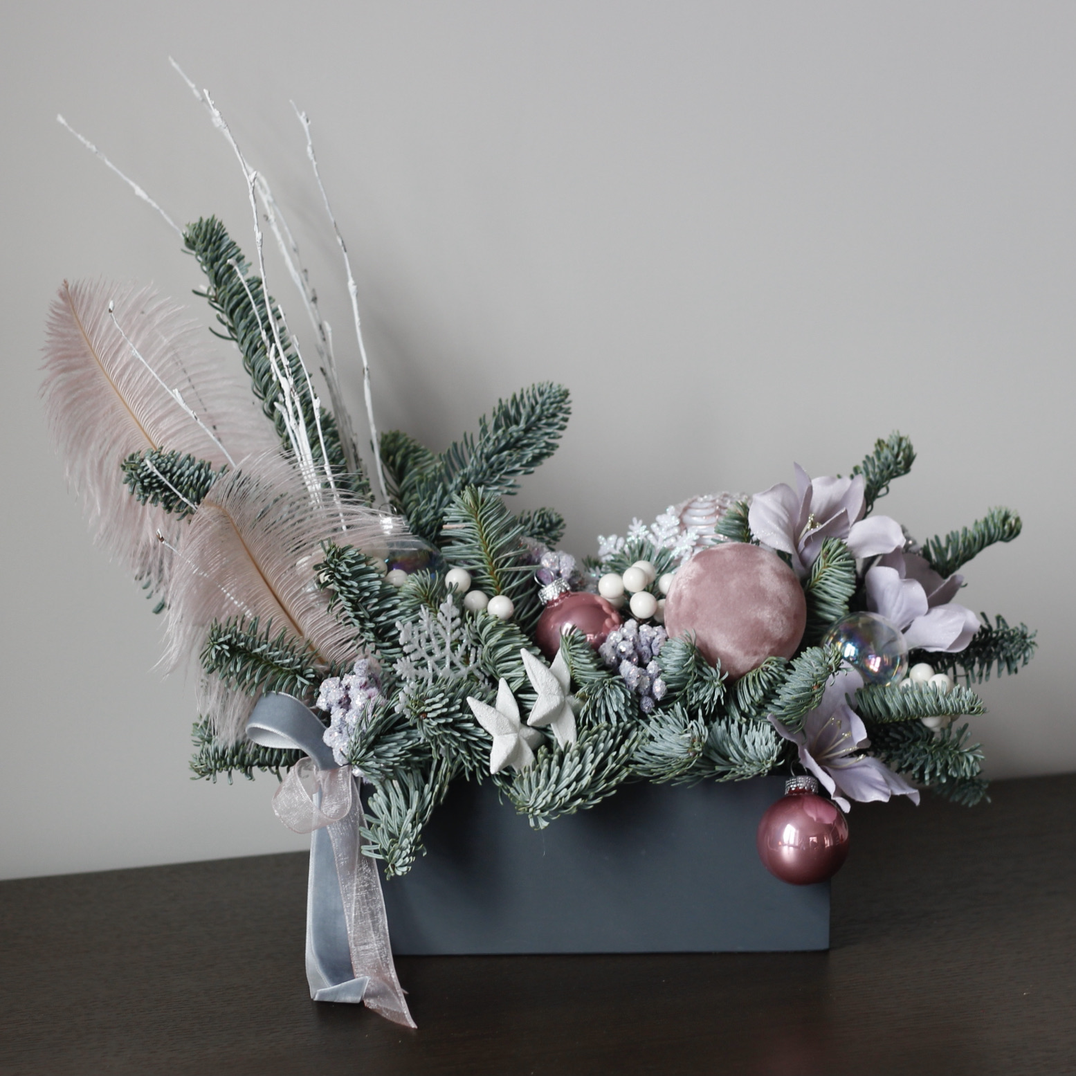 Стильная новогодняя композиция из живой датской ели в кашпо.