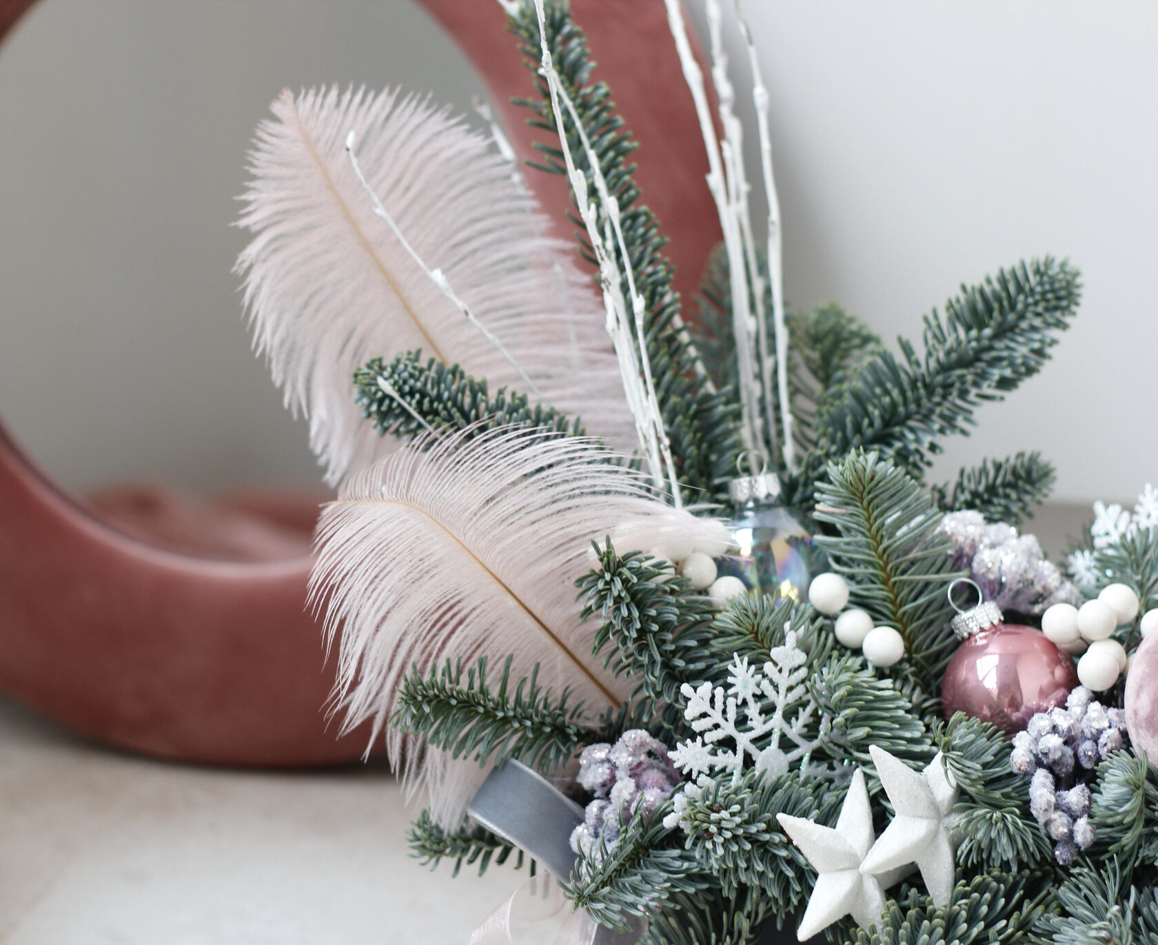 Декорирована стеклянными игрушками, перьями, заснеженными веточками и множеством других декоративных элементов.