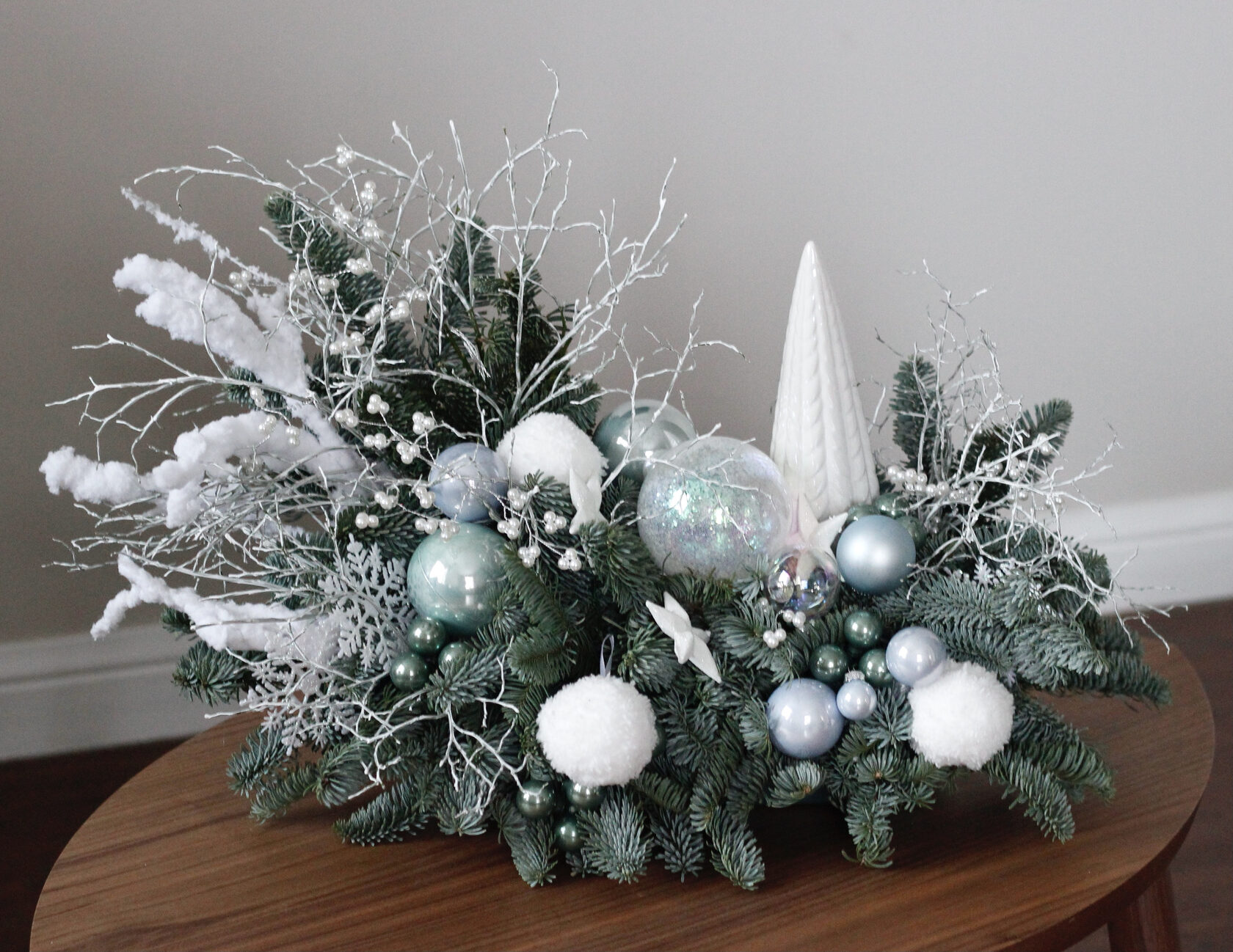 Декорирована стеклянными игрушками, керамической елочкой, заснеженными веточками и множеством других элементов.