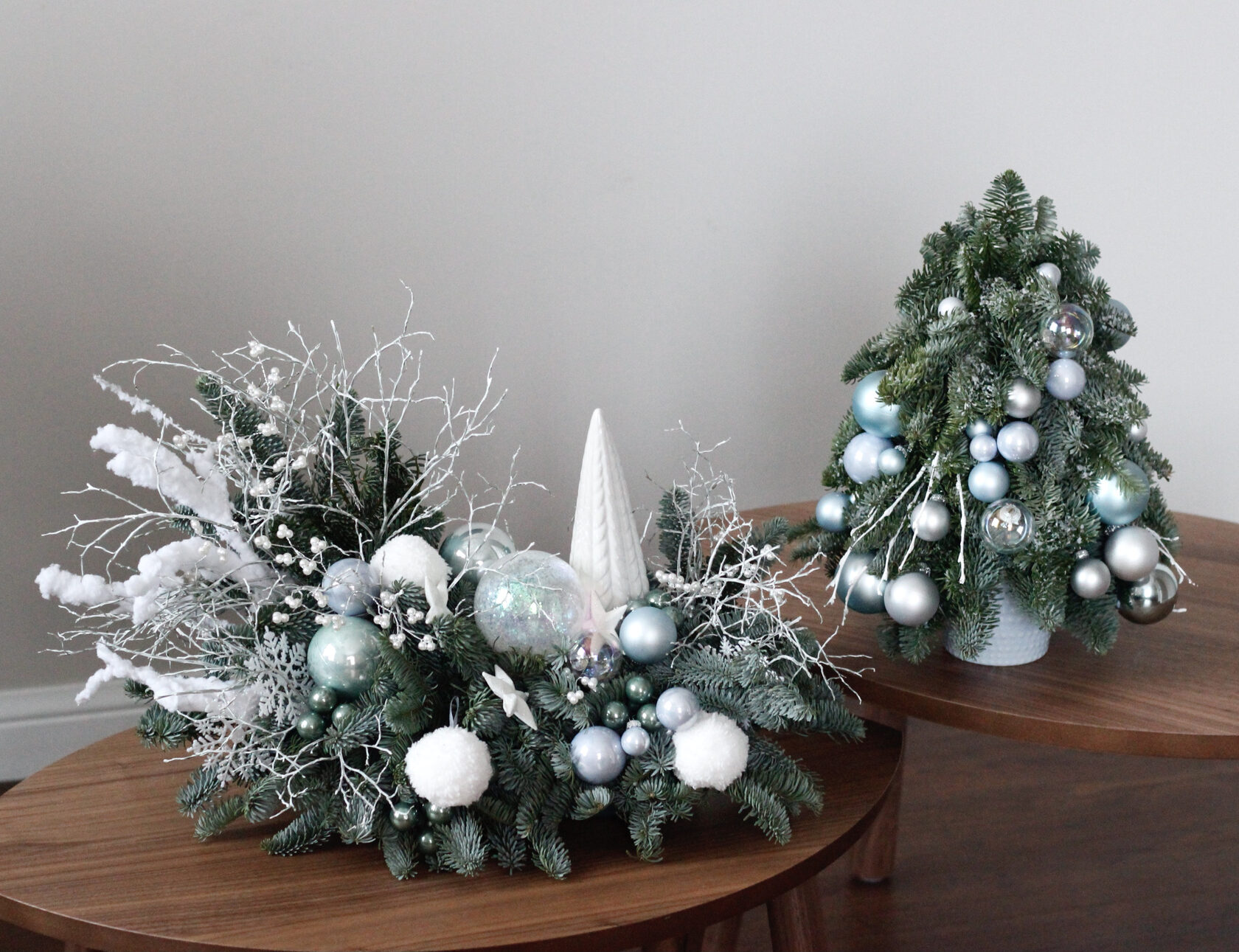 Стильная новогодняя композиция из живой датской ели в монохромной белой гамме.