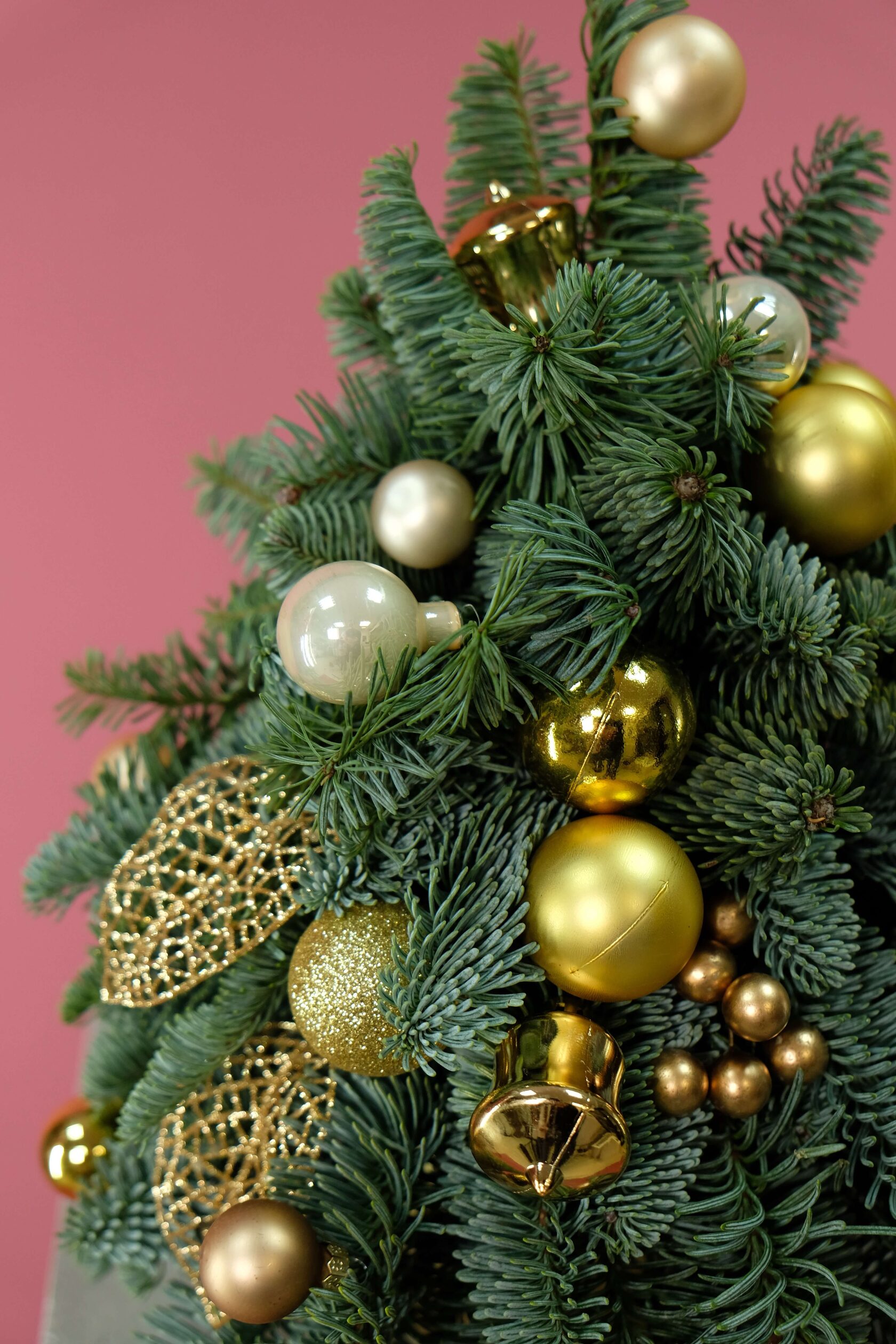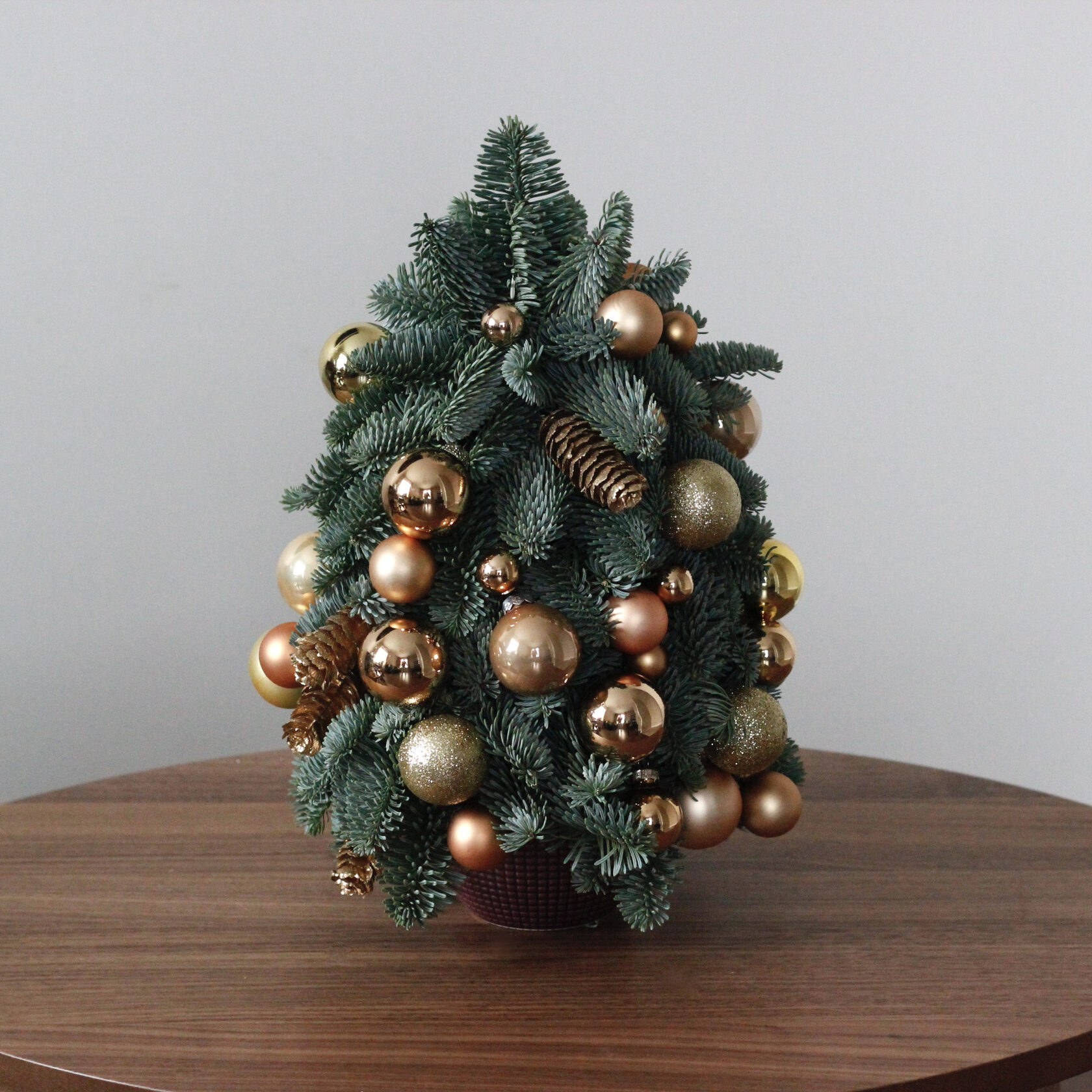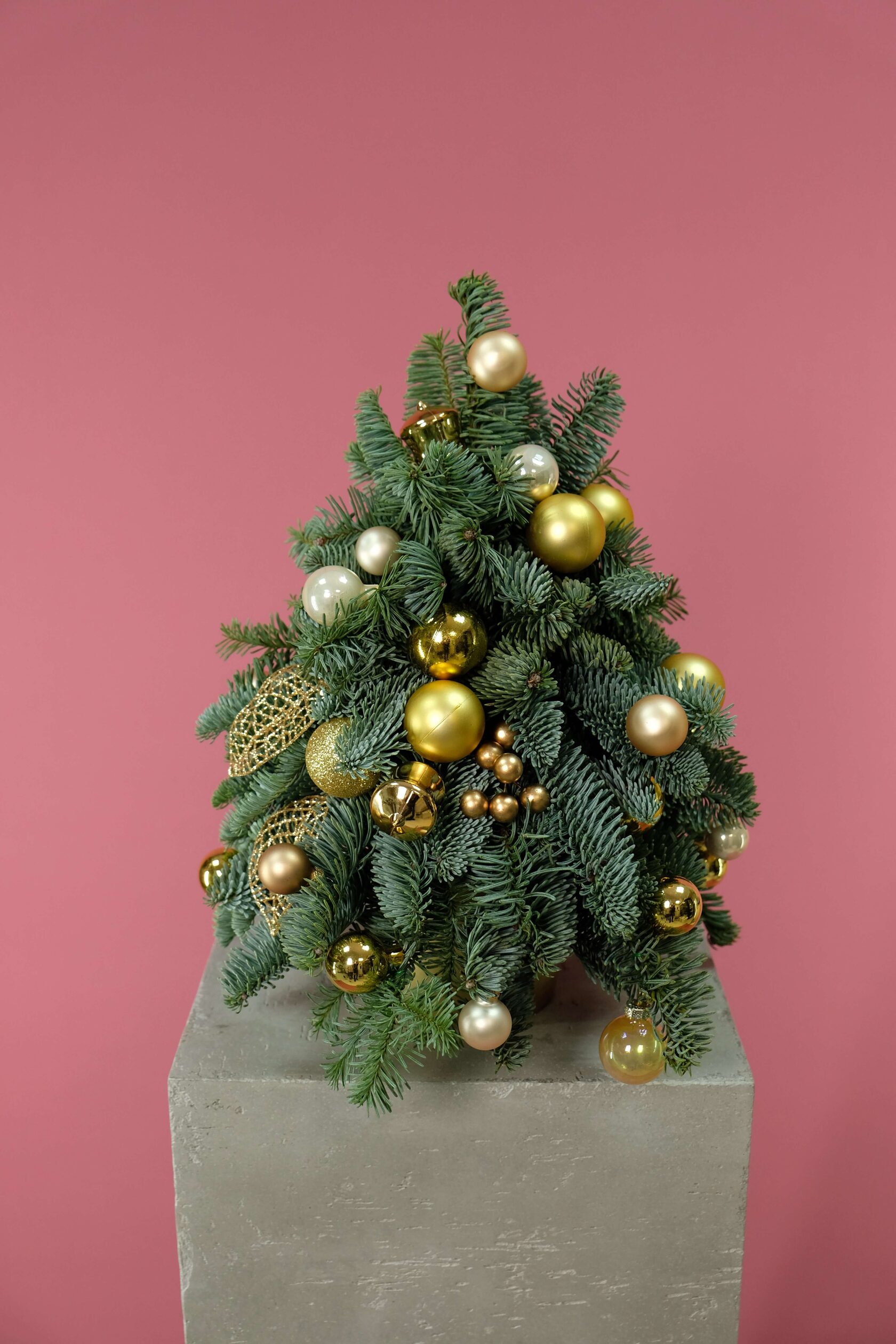 Авторская елочка ручной работы из живой датской голубой ели в монхромной золотой гамме.